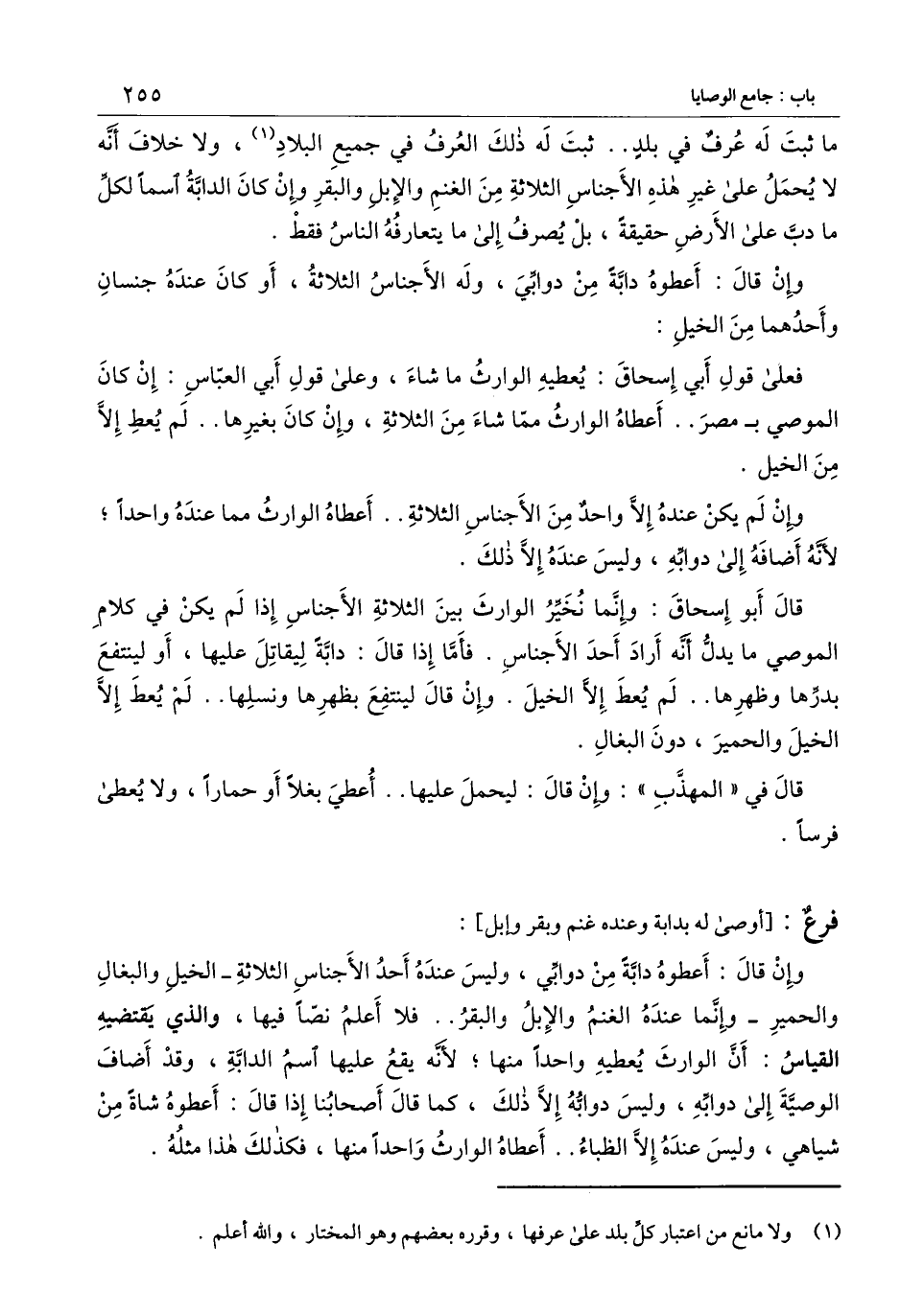 ما ثبت له عرف في بلد. ثبت له ذلك العرف في جميع البلاد، ولا خلاف أنه لا يحمل على غير هذه الأجناس الثلاثة من الغنم والإبل والبقر وإن كان الدابة اسما لكل ما دب على الأرض حقيقة، بل يصرف إلى ما يتعارفه الناس فقط.