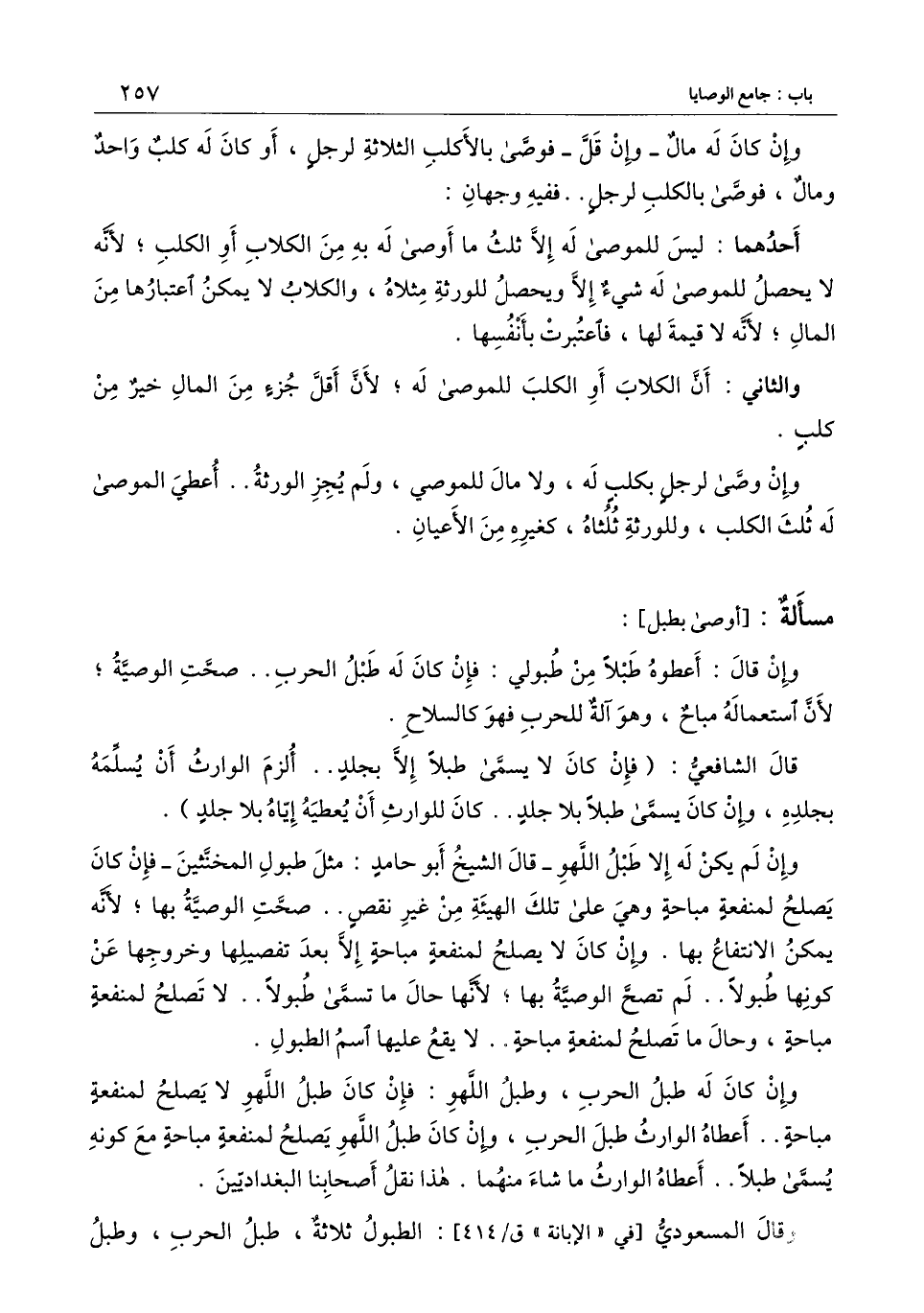 وإن لم يكن له إلا طبل اللهو- قال الشيخ أبو حامد - مثل طبول المخنثين- فإن كان يصلح لمنفعة مباحة وهي على تلك الهيئة من غير نقص.. صحت الوصية بها؛ لأنه يمكن الانتفاع بها. وإن كان لا يصلح لمنفعة مباحة إلا بعد تفصيلها وخروجها عن كونها طبولاً.. لم تصح الوصية بها؛ لأنها حال ما تسمى طبولاً.. لا تصلح لمنفعة مباحة، وحال ما تصلح لمنفعة مباحة.. لا يقع عليها اسم الطبول.