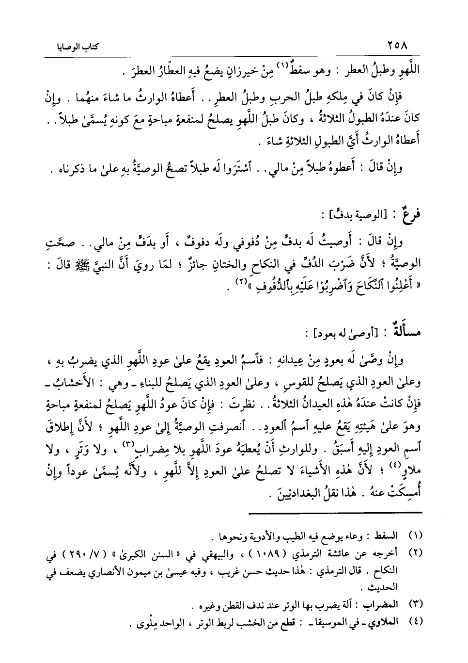وإن وصى له بعود من عيدانه: " فاسم العود يقع على عود اللهو الذي يضرب به، وعلى العود الذي يصلح للقوس وعلى العود الذي يصلح للبناء- وهي: الأخشاب- فإن كانت عنده هذه العيدان الثلاثة.. نظرت: فإن كان عود اللهو يصلح لمنفعة مباحة وهو على هيئته يقع عليه اسم العود.. انصرفت الوصية إلى عود اللهو؛ لأن إطلاق اسم العود إليه أسبق. وللوارث أن يعطيه عود اللهو بلا مضراب، ولا وتر، ولا ملاو؛ لأن هذه الأشياء لا تصلح على العود إلا للهو، ولأنه يسمى عوداً وإن أمسكت عنه. هذا نقل البغداديين.