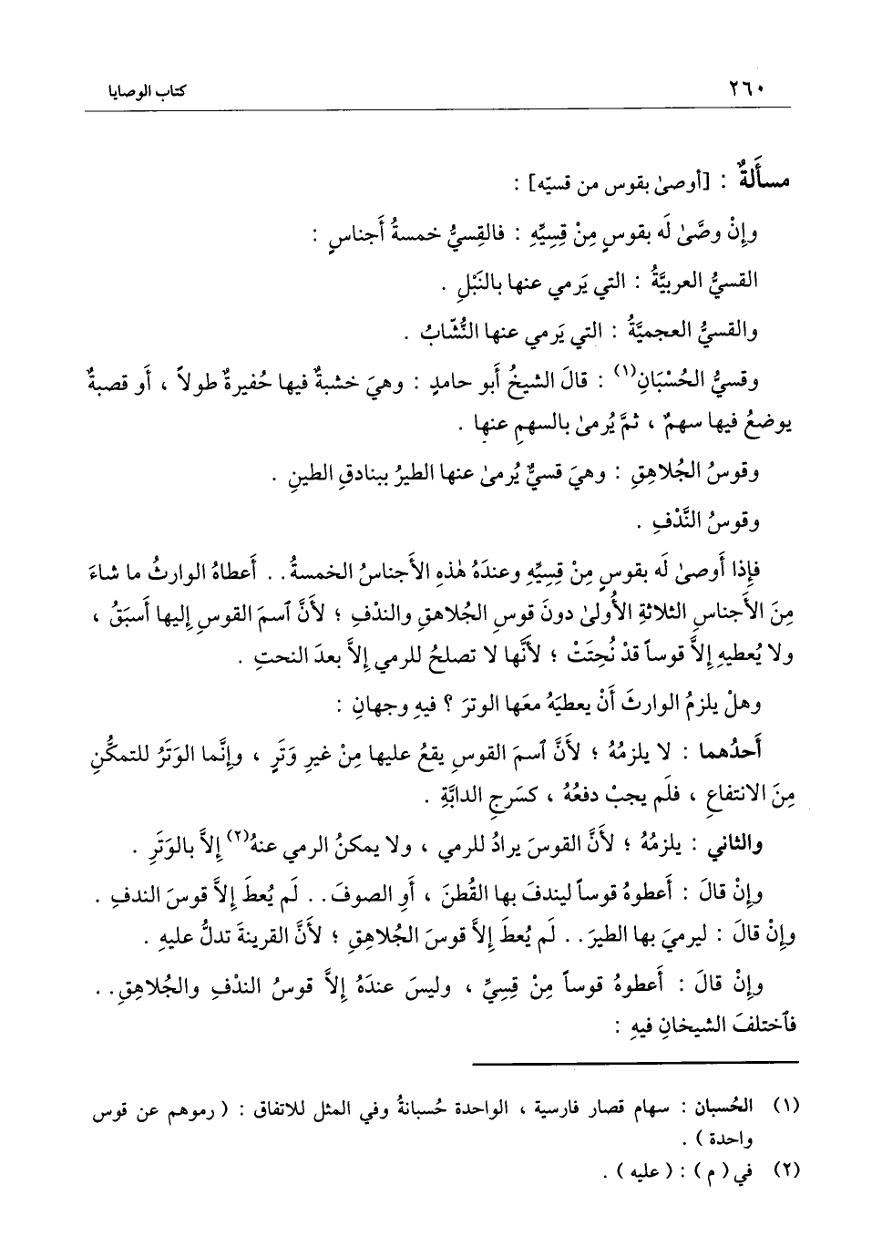 فإذا أوصى له بقوس من قسيه وعنده هذه الأجناس الخمسة.. أعطاه الوارث ما شاء من الأجناس الثلاثة الأولى دون قوس الجلاهق والندف؛ لأن اسم القوس إليها أسبق، ولا يعطيه إلا قوساً قد نحتت؛ لأنها لا تصلح للرمي إلا بعد النحت.