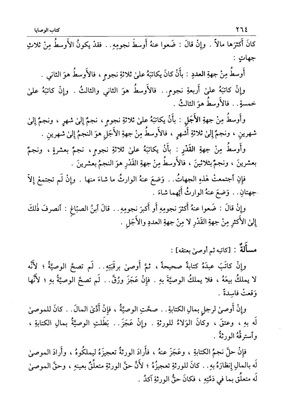 وإن أوصى لرجل بمال الكتابة.. صحت الوصية، فإن أدى المال.. كان للموصى له به، وعتق، وكان الولاء للورثة. وإن عجز.. بطلت الوصية بمال الكتابة، واسترقه الورثة.