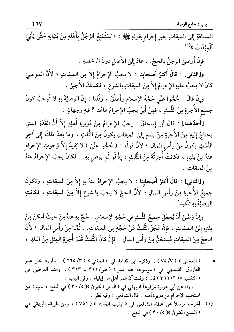 و [الثاني] : قال أكثر أصحابنا: لا يجب الإحرام عنه به إلا من الميقات، وتكون جميع الأجرة من رأس المال؛ لأن الحج لا يجب بالشرع إلا من الميقات، فكانت الوصية به تأكيداً.