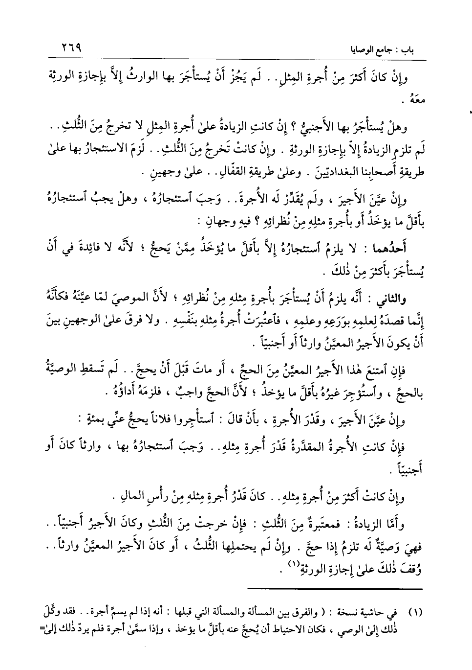 وإن كانت أكثر من أجرة مثله.. كان قدر أجرة مثله من رأس المال. وأما الزيادة: فمعتبرة من الثلث: فإن خرجت من الثلث وكان الأجير أجنبياً فهي وصية له تلزم إذا حج. وإن لم يحتملها الثلث، أو كان الأجير المعين وارثاً.. وقف ذلك على إجازة الورثة.