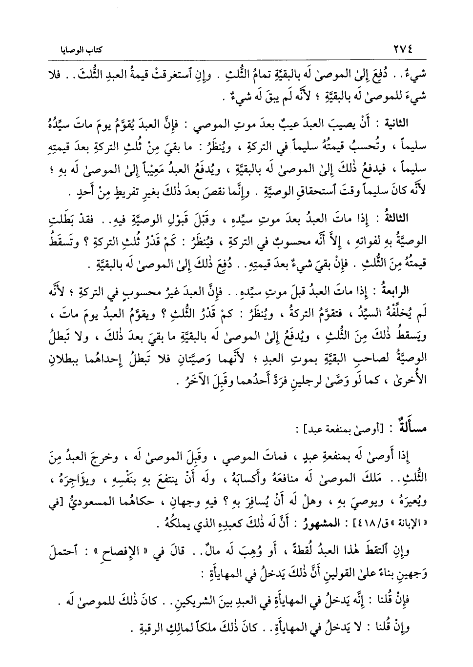 الثالثة: إذا مات العبد بعد موت سيده، وقبل قبول الوصية فيه.. فقد بطلت الوصية به لفواته، إلا أنه محسوب في التركة، فينظر: كم قدر ثلث التركة؟ وتسقط قيمته من الثلث. فإن بقي شيء بعد قيمته.. دفع ذلك إلى الموصى له بالبقية. الرابعة: إذا مات العبد قبل موت سيده.. فإن العبد غير محسوب في التركة؛ لأنه لم يخلفه السيد، فتقوم التركة، وينظر: كم قدر الثلث؟ ويقوم العبد يوم مات، ويسقط ذلك من الثلث، ويدفع إلى الموصى له بالبقية ما بقي بعد ذلك، ولا تبطل الوصية لصاحب البقية بموت العبد؛ لأنهما وصيتان فلا تبطل إحداهما ببطلان الأخرى، كما لو وصى لرجلين فرد أحدهما وقبل الآخر.