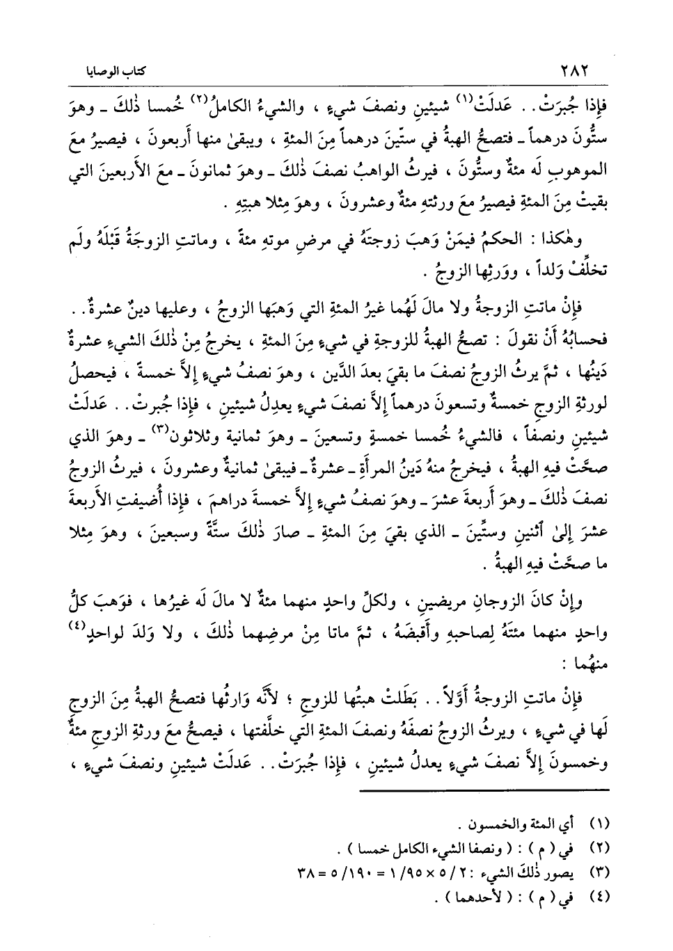 فإن ماتت الزوجة ولا مال لهما غير المائة التي وهبها الزوج، وعليها دين عشرة.. فحسابه أن نقول: تصح الهبة للزوجة في شيء من المائة، يخرج من ذلك الشيء عشرة دينها، ثم يرث الزوج نصف ما بقي بعد الدين، وهو نصف شيء إلا خمسة، فيحصل لورثة الزوج خمسة وتسعون درهما إلا نصف شيء يعدل شيئين، فإذا جبرت.. عدلت شيئين ونصفاً، فالشيء خمسا خمسة وتسعين - وهو ثمانية وثلاثون- وهو الذي صحت فيه الهبة، فيخرج منه دين المرأة- عشرة - فيبقى ثمانية وعشرون، فيرث الزوج نصف ذلك- وهو أربعة عشر- وهو نصف شيء إلا خمسة دراهم، فإذا أضيفت الأربعة عشر إلى اثنين وستين - الذي بقي من المائة - صار ذلك ستة وسبعين، وهو مثلا ما صحت فيه الهبة.