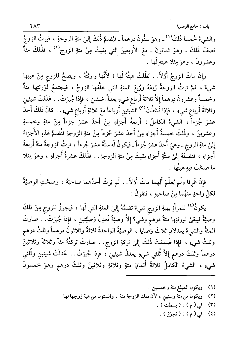 يكون للمرأة بهبة الزوج شيء تضمه إلى المائة التي لها، فيجوز للزوج من ذلك وصية فيبقى لورثتها مائة درهم وشيء إلا وصية تعدل وصيتين، فإذا جبرت.. صارت المائة والشيء يعدلان ثلاث وصايا، الوصية الواحدة ثلاثة وثلاثون درهما وثلث درهم وثلث شيء، فإذا ضممت ذلك إلى تركة الزوج.. صارت تركته مائة وثلاثة وثلاثين درهما وثلث درهم إلا ثلثي شيء يعدل شيئين، فإذا جبرت.. عدلت شيئين وثلثي شيء، الشيء الكامل ثلاثة أثمان مائة وثلاثة وثلاثين وثلث درهم وهو خمسون