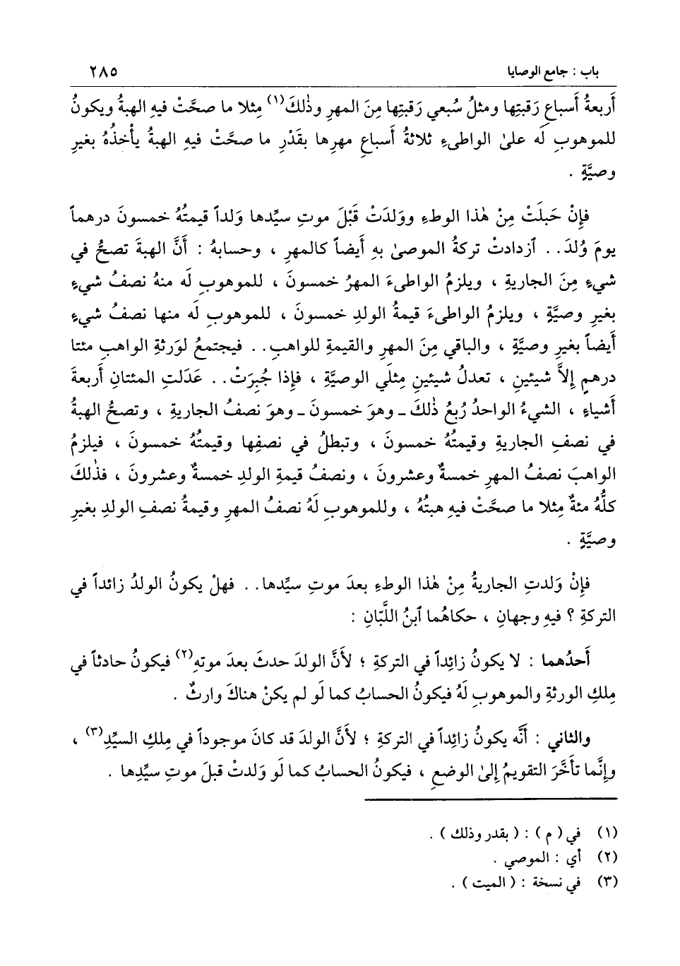 فإن حبلت من هذا الوطء وولدت قبل موت سيدها ولداً قيمته خمسون درهماً يوم ولد ... ازدادت تركة الموصى به أيضاً كالمهر، وحسابه: أن الهبة تصح في شيء من الجارية، ويلزم الواطئ المهر خمسون، للموهوب له منه نصف شيء بغير وصية، ويلزم الواطئ قيمة الولد خمسون، للموهوب له منها نصف شيء أيضاً بغير وصية، والباقي من المهر والقيمة للواهب.. فيجتمع لورثة الواهب مائتا درهم إلا شيئين، تعدل شيئين مثلي الوصية، فإذا جبرت.. عدلت المائتان أربعة أشياء الشيء الواحد ربع ذلك - وهو خمسون - وهو نصف الجارية، وتصح الهبة في نصف الجارية وقيمته خمسون، وتبطل في نصفها وقيمته خمسون، فيلزم الواهب نصف المهر خمسة وعشرون، ونصف قيمة الولد خمسة وعشرون، فذلك كله مائة مثلاً ما صحت فيه هبته، وللموهوب له نصف المهر وقيمة نصف الولد بغير وصية.
