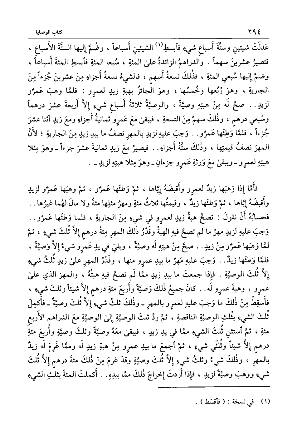عدلت شيئين وستة أسباع شيء فابسط الشيئين أسباعاً، وضم إليها الستة الأسباع، فتصير عشرين سهماً. والدراهم الزائدة على المائة، سبعا المائة فابسط المائة أسباعاً، وضم إليها سبعي المائة، فذلك تسعة أسهم، فالشيء تسعة أجزاء من عشرين جزءاً من الجارية، وهو ربعها وخمسها، وهو الجائز بهبة زيد لعمرو: فلما وهب عمرو لزيد.. صح له من هبته وصية، والوصية ثلاثة أسباع شيء إلا أربعة عشر درهماً وسبعي درهم، وذلك سهم من التسعة، فيبقى مع عمرو ثمانية أجزاء ومع زيد اثنا عشر جزءاً، فلما وطئها عمرو.. وجب عليه لزيد بالمهر نصف ما بيد زيد من الجارية؛ لأن المهر نصف قيمتها، وذلك ستة أجزاء.. فيصير مع زيد ثمانية عشر جزءاً ـ وهو مثلا هبته لعمرو ـ ويبقى مع ورثة عمرو جزآن ـ وهو مثلا هبته لزيد ـ.