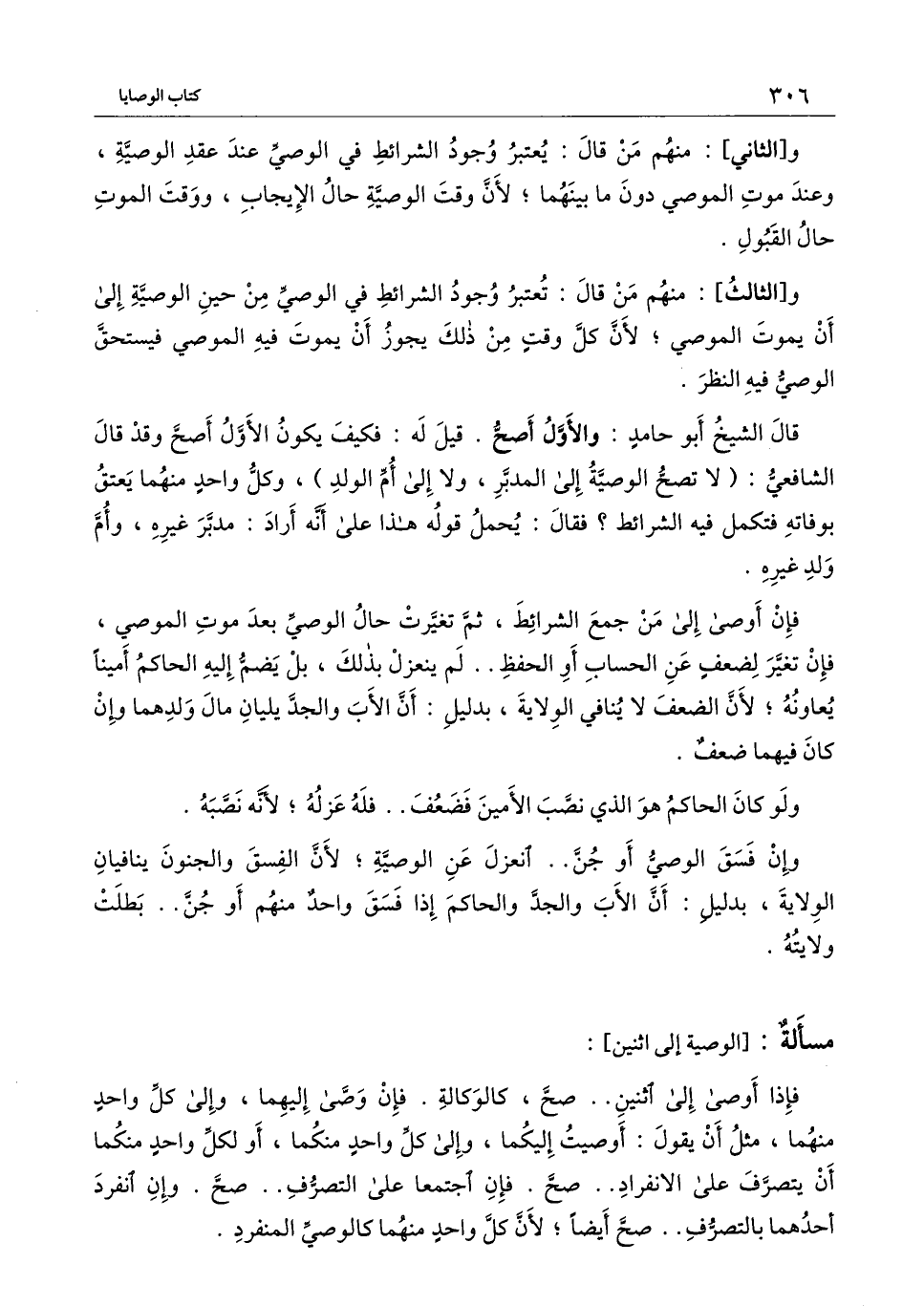و [الثالث] : منهم من قال: تعتبر وجود الشرائط في الوصي من حين الوصية إلى أن يموت الموصي؛ لأن كل وقت من ذلك يجوز أن يموت فيه الموصي فيستحق الوصي فيه النظر.