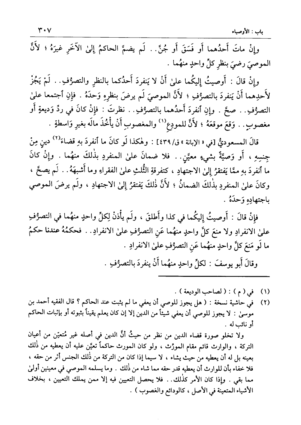 قال المسعودي [في " الإبانة " ق\ 439] : وهكذا لو كان ما انفرد به قضاء دين من جنسه، أو وصية بشيء معين.. فلا ضمان على المنفرد بذلك منهما. وإن كان ما انفرد به مما يفتقر إلى الاجتهاد، كتفرقة الثلث على الفقراء وما أشبهه.. لم يصح، وكان على المنفرد بذلك الضمان؛ لأن ذلك يفتقر إلى الاجتهاد، ولم يرض الموصي باجتهاده وحده.