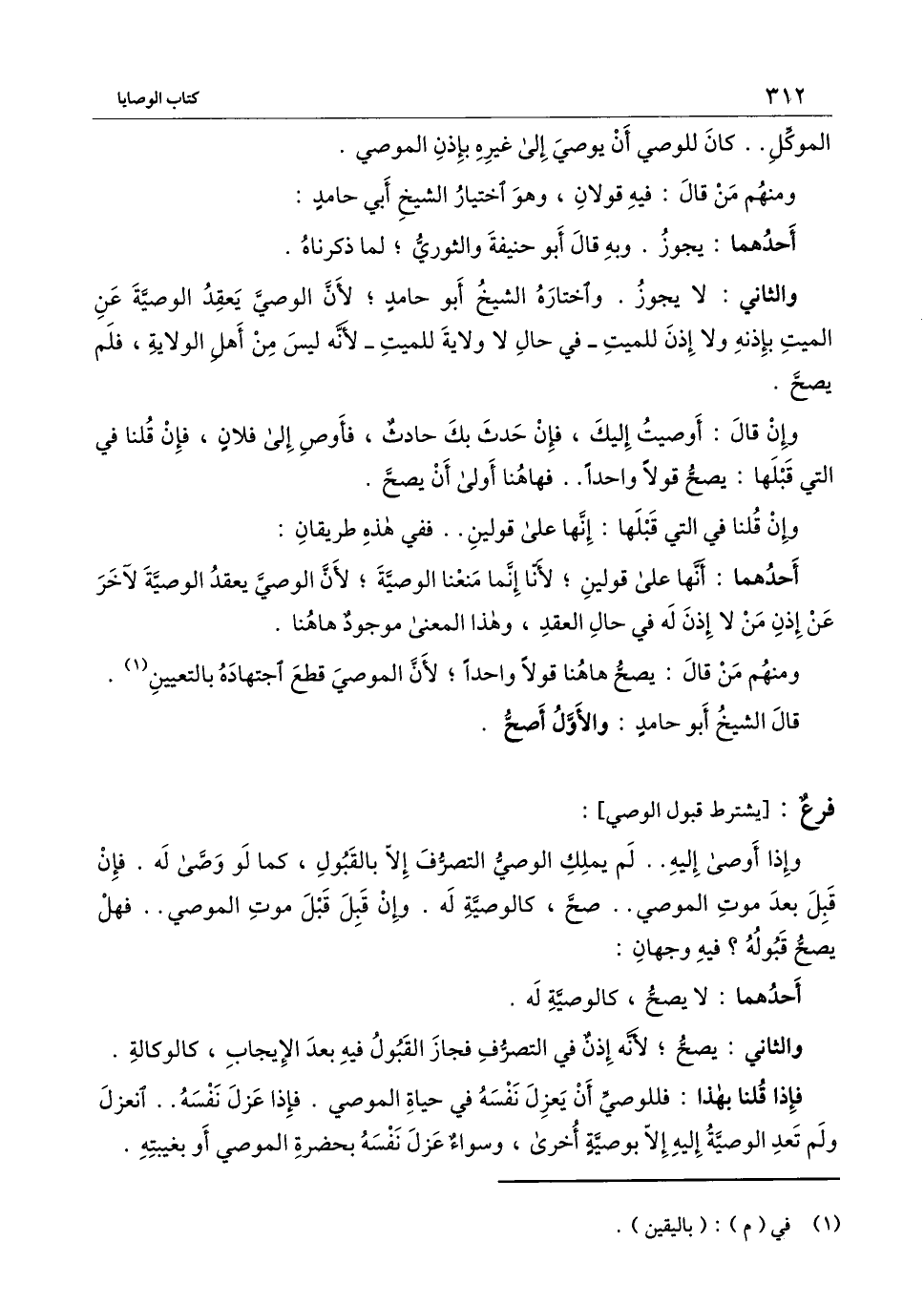 فإذا قلنا بهذا: فللوصي أن يعزل نفسه في حياة الموصي. فإذا عزل نفسه.. انعزل ولم تعد الوصية إليه إلا بوصية أخرى، وسواء عزل نفسه بحضرة الموصي أو بغيبته.