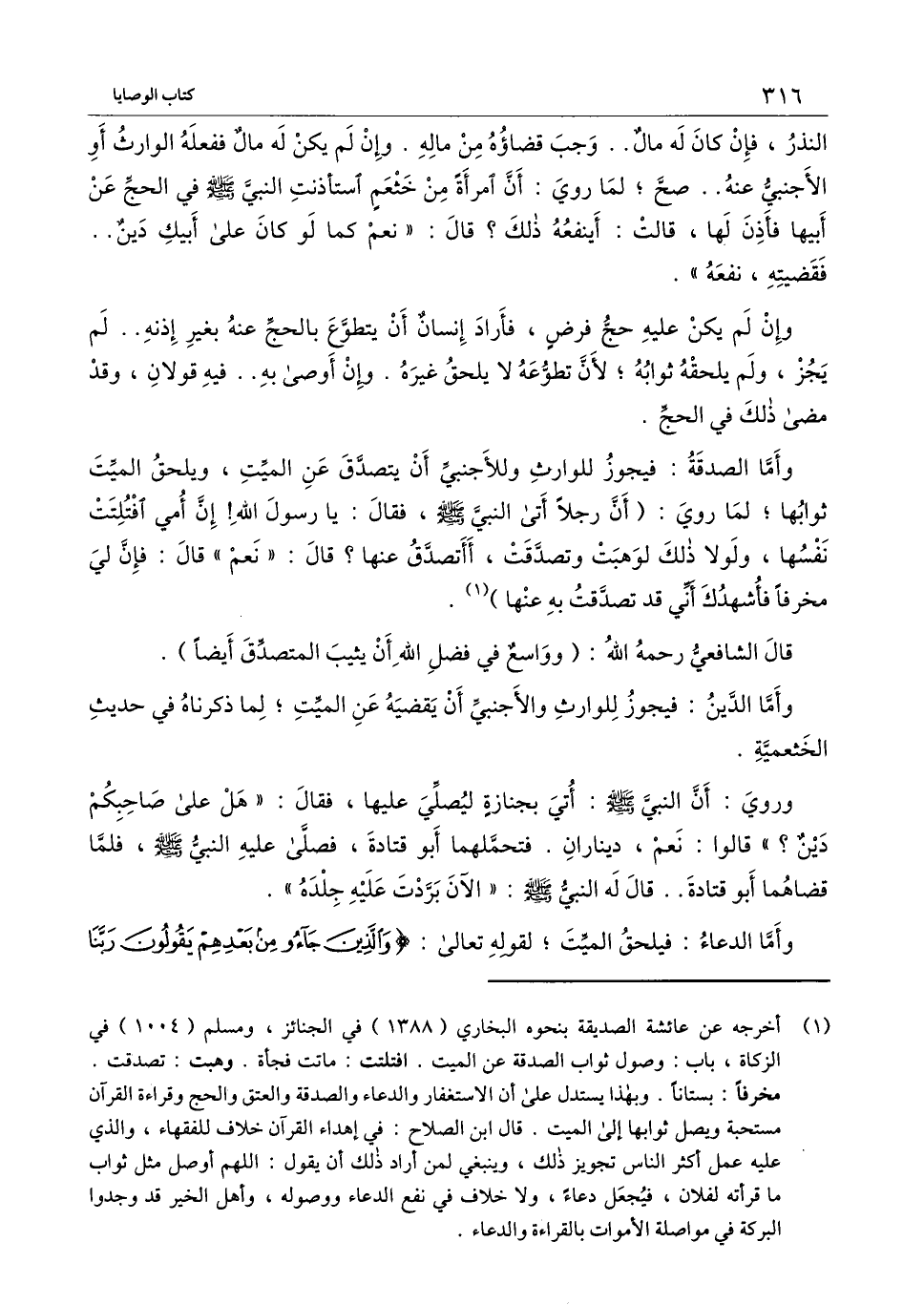 وأما الصدقة: فيجوز للوارث وللأجنبي أن يتصدق عن الميت، ويلحق الميت ثوابها؛ لما روي: «أن رجلا أتى النبي - صَلَّى اللَّهُ عَلَيْهِ وَسَلَّمَ -، فقال: يا رسول الله! إن أمي افتلتت نفسها، ولولا ذلك لوهبت وتصدقت، أأتصدق عنها؟ قال: "نعم" قال: فإن لي مخرفاً فأشهدك أني قد تصدقت به عنها» .