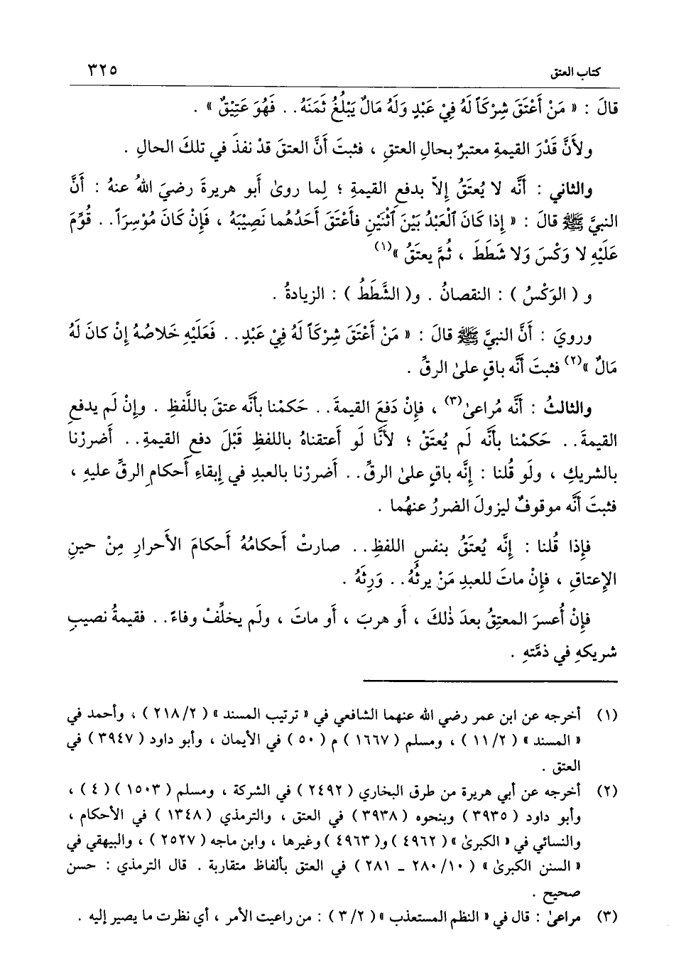 والثالث: أنه مراعى، فإن دفع القيمة.. حكمنا بأنه عتق باللفظ. وإن لم يدفع القيمة.. حكمنا بأنه لم يعتق؛ لأنا لو أعتقناه باللفظ قبل دفع القيمة.. أضررنا بالشريك، ولو قلنا: إنه باق على الرق.. أضررنا بالعبد في إبقاء أحكام الرق عليه، فثبت أنه موقوف ليزول الضرر عنهما.