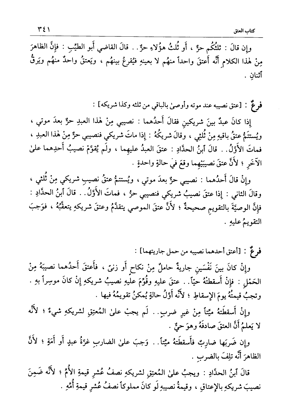 إذا كان عبد بين شريكين فقال أحدهما: نصيبي من هذا العبد حر بعد موتي، ويستتم عتق باقيه من ثلثي، وقال شريكه: إذا مات شريكي فنصيبي حر من هذا العبد، فمات الأول.. قال ابن الحداد: عتق العبد عليهما، ولم يقوم نصيب أحدهما على الآخر؛ لأن عتق نصيبيهما وقع في حالة واحدة.