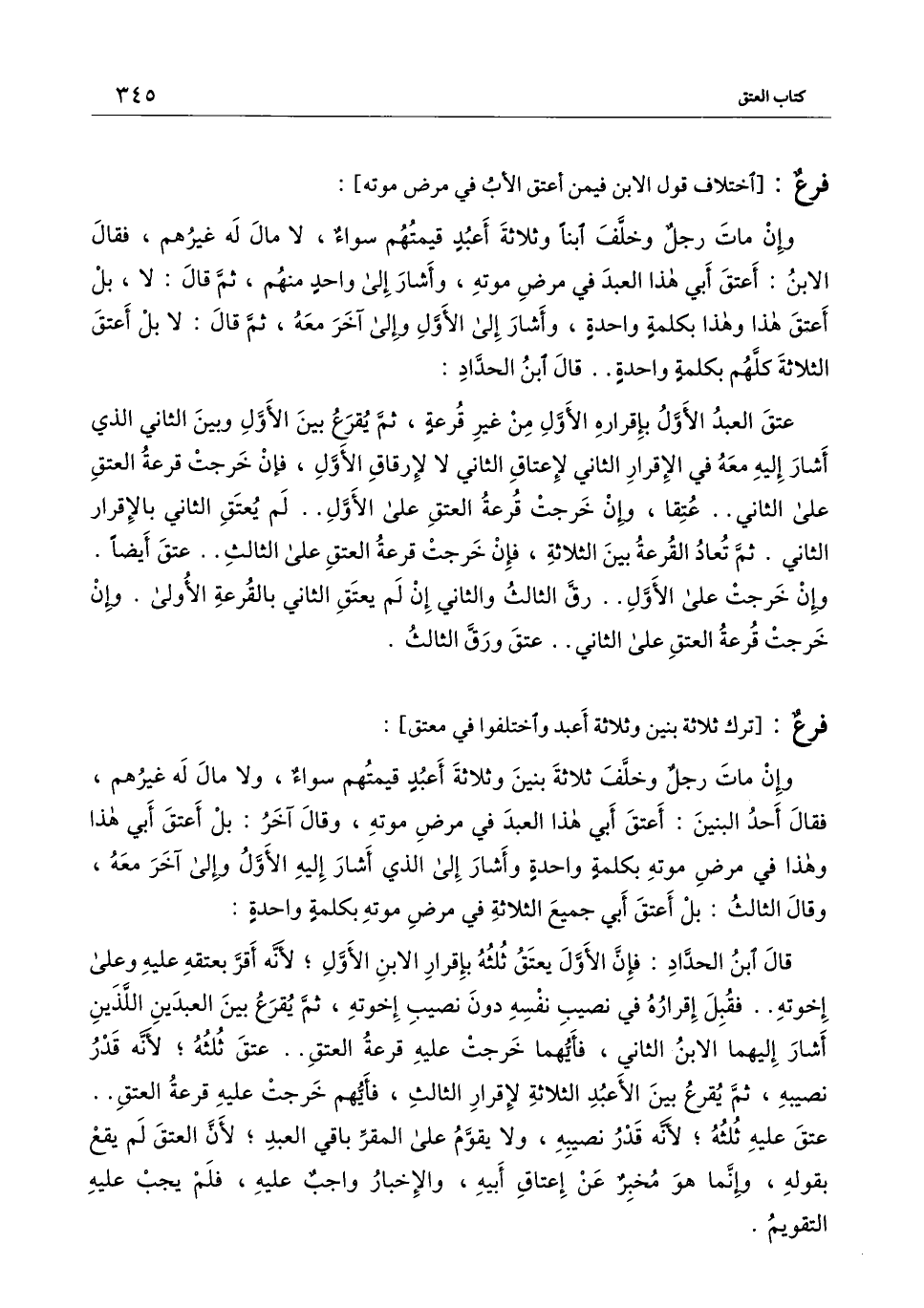 وإن مات رجل وخلف ابناً وثلاثة أعبد قيمتهم سواء، لا مال له غيرهم، فقال الابن: أعتق أبي هذا العبد في مرض موته، وأشار إلى واحد منهم، ثم قال: لا، بل أعتق هذا وهذا بكلمة واحدة، وأشار إلى الأول وإلى آخر معه، ثم قال: لا بل أعتق الثلاثة كلهم بكلمة واحدة.. قال ابن الحداد: