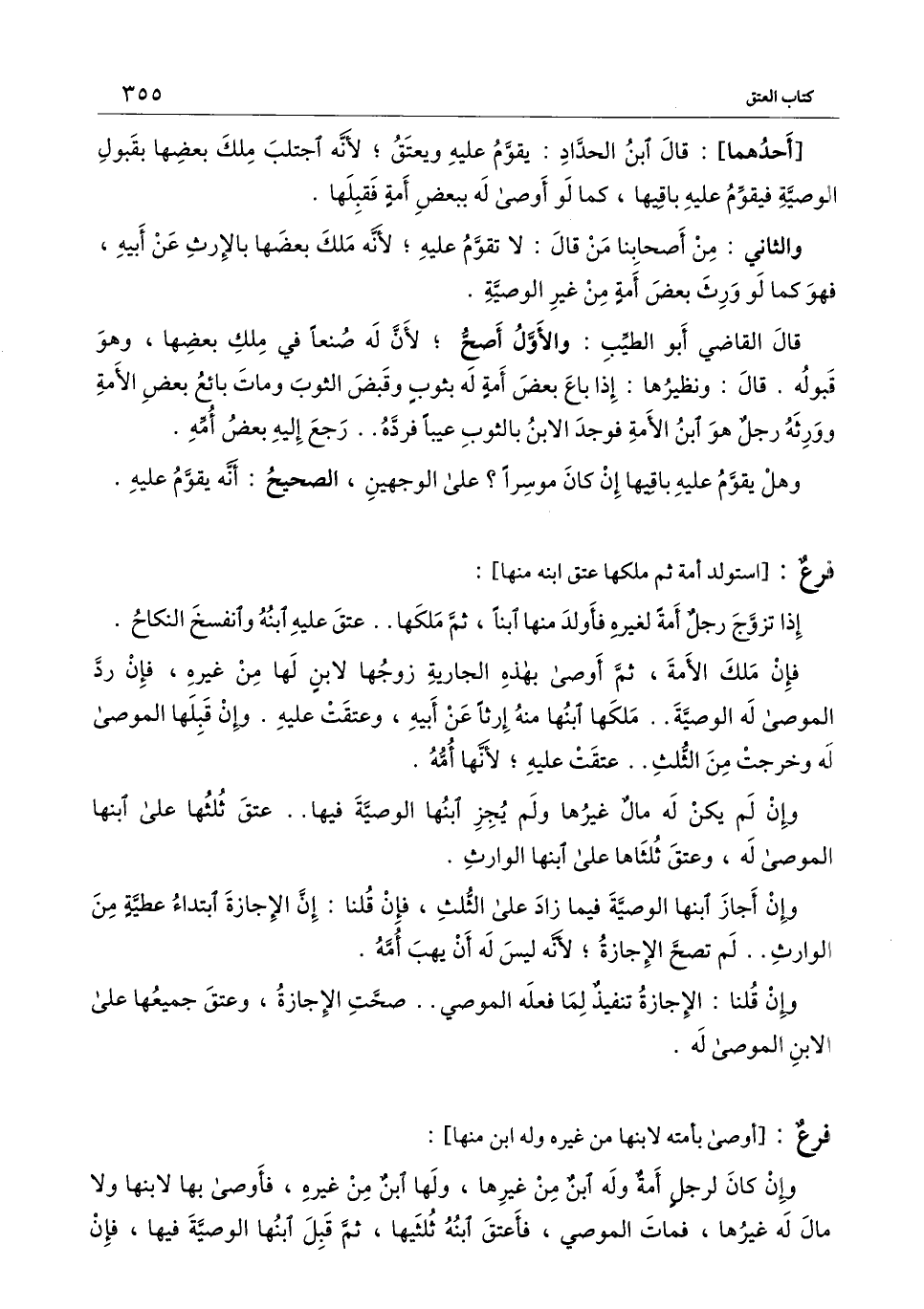 (أحدهما) : قال ابن الحداد: يقوم عليه ويعتق؛ لأنه اجتلب ملك بعضها بقبول الوصية فيقوم عليه باقيها، كما لو أوصى له ببعض أمة فقبلها.
