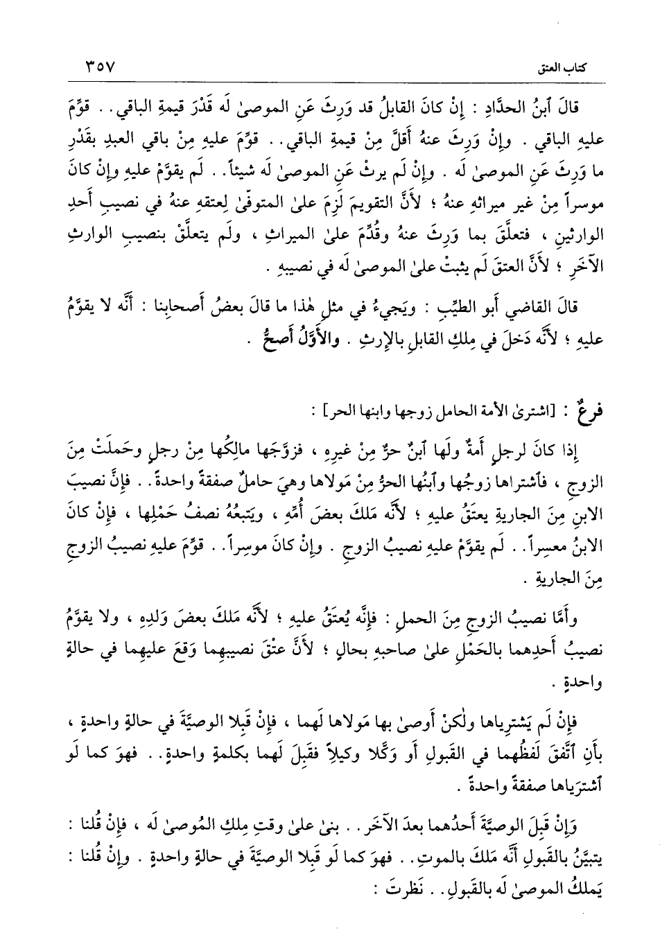 قال ابن الحداد: إن كان القابل قد ورث عن الموصى له قدر قيمة الباقي.. قوم عليه الباقي. وإن ورث عنه أقل من قيمة الباقي.. قوم عليه من باقي العبد بقدر ما ورث عن الموصى له. وإن لم يرث عن الموصى له شيئاً.. لم يقوم عليه وإن كان موسراً من غير ميراثه عنه؛ لأن التقويم لزم على المتوفى لعتقه عنه في نصيب أحد الوارثين، فتعلق بما ورث عنه وقدم على الميراث، ولم يتعلق بنصيب الوارث الآخر؛ لأن العتق لم يثبت على الموصى له في نصيبه.