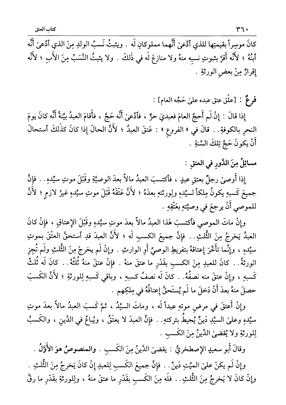 مسائل من الدور في العتق: إذا أوصى رجل بعتق عبد، فاكتسب العبد مالا بعد الوصية وقبل موت سيده.. فإن جميع كسبه يكون ملكاً لسيدة ولورثته بعده؛ لأن عتقه قبل موت سيده غير لازم؛ لأن للموصي أن يرجع في وصيته بعتقه.