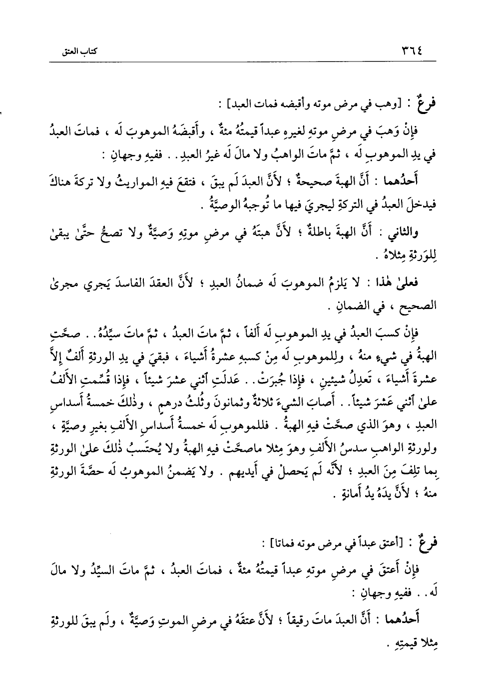 فإن كسب العبد في يد الموهوب له ألفاً، ثم مات العبد، ثم مات سيده.. صحت الهبة في شيء منه، وللموهوب له من كسبه عشرة أشياء، فبقي في يد الورثة ألف إلا عشرة أشياء، تعدل شيئين، فإذا جبرت.. عدلت اثني عشر شيئاً، فإذا قسمت الألف على اثني عشر شيئاً.. أصاب الشيء ثلاثة وثمانون وثلث درهم، وذلك خمسة أسداس العبد، وهو الذي صحت فيه الهبة. فللموهوب له خمسة أسداس الألف بغير وصية، ولورثة الواهب سدس الألف وهو مثلاً ما صحت فيه الهبة ولا يحتسب ذلك على الورثة بما تلف من العبد؛ لأنه لم يحصل في أيديهم. ولا يضمن الموهوب له حصة الورثة منه؛ لأن يده أمانة.