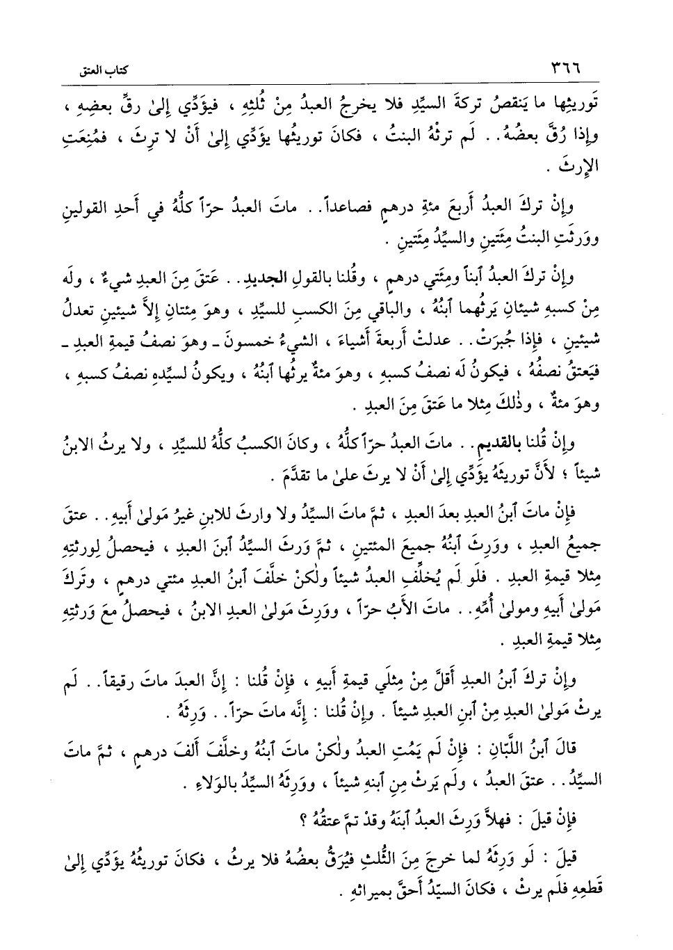 وإن ترك العبد ابناً ومائتي درهم، وقلنا بالقول الجديد.. عتق من العبد شيء، وله من كسبه شيئان يرثهما ابنه، والباقي من الكسب للسيد، وهو مائتان إلا شيئين تعدل شيئين، فإذا جبرت.. عدلت أربعة أشياء، الشيء خمسون - وهو نصف قيمة العبد - فيعتق نصفه، فيكون له نصف كسبه، وهو مائة منه يرثها ابنه، ويكون لسيده نصف كسبه، وهو مائة، وذلك مثلاً ما عتق من العبد.