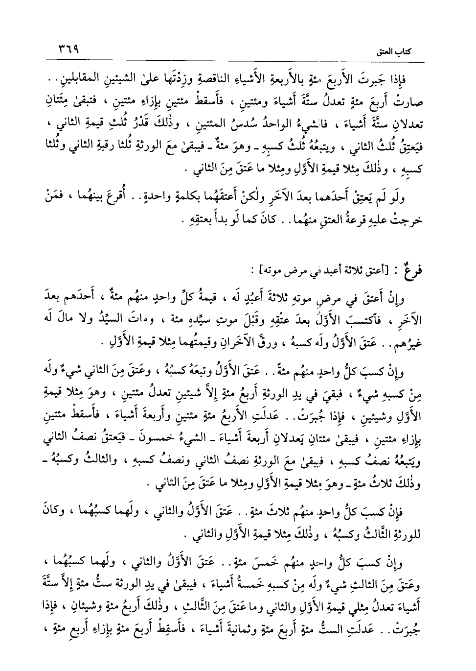 فإذا جبرت الأربعمائة بالأربعة الأشياء الناقصة وزدتها على الشيئين المقابلين.. صارت أربعمائة تعدل ستة أشياء ومائتين، فأسقط مائتين بإزاء مائتين، فتبقى مائتان تعدلان ستة أشياء، فالشيء الواحد سدس المائتين، وذلك قدر ثلث قيمة الثاني، فيعتق ثلث الثاني، ويتبعه ثلث كسبه - وهو مائة- فيبقى مع الورثة ثلثا رقبة الثاني وثلثا كسبه، وذلك مثلاً قيمة الأول ومثلاً ما عتق من الثاني.