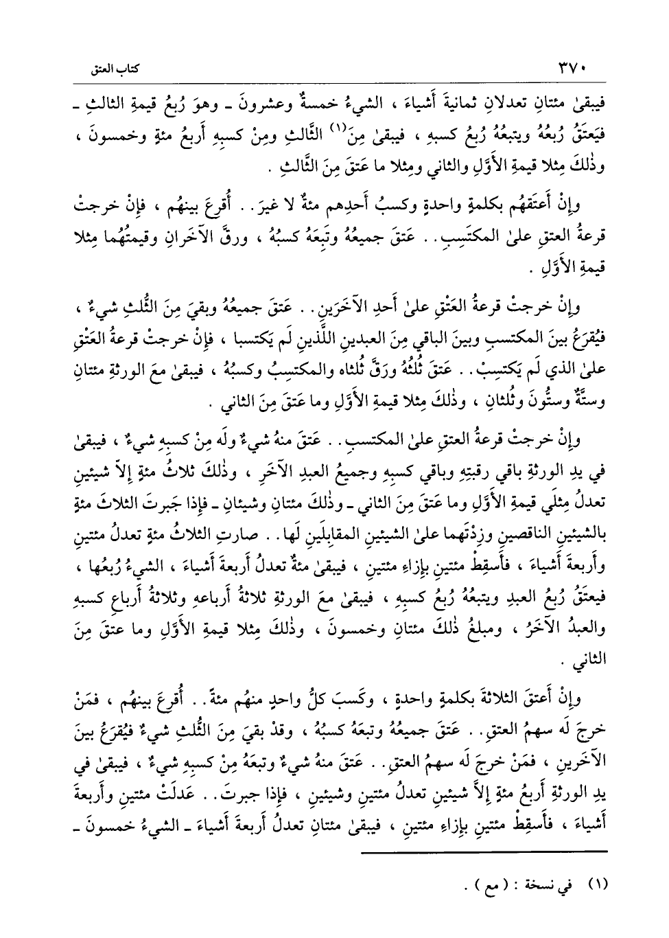 وإن خرجت قرعة العتق على المكتسب.. عتق منه شيء وله من كسبه شيء، فيبقى في يد الورثة باقي رقبته وباقي كسبه وجميع العبد الآخر، وذلك ثلاثمائة إلا شيئين تعدل مثلي قيمة الأول وما عتق من الثاني - وذلك مائتان وشيئان - فإذا جبرت الثلاثمائة بالشيئين الناقصين وزدتهما على الشيئين المقابلين لها.. صارت الثلاثمائة تعدل مائتين وأربعة أشياء، فأسقط مائتين بإزاء مائتين، فيبقى مائة تعدل أربعة أشياء، الشيء ربعها، فيعتق ربع العبد ويتبعه ربع كسبه، فيبقى مع الورثة ثلاثة أرباعه وثلاثة أرباع كسبه والعبد الآخر، ومبلغ ذلك مائتان وخمسون، وذلك مثلاً قيمة الأول وما عتق من الثاني.