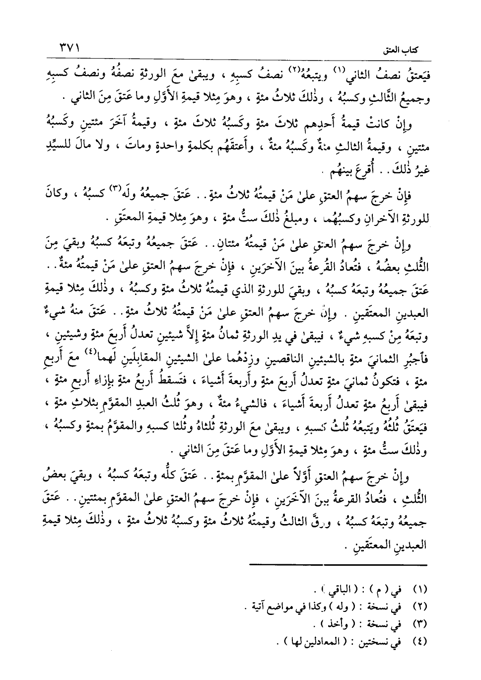 وإن خرج سهم العتق على من قيمته مائتان.. عتق جميعه وتبعه كسبه وبقي من الثلث بعضه، فتعاد القرعة بين الآخرين، فإن خرج سهم العتق على من قيمته مائة.. عتق جميعه وتبعه كسبه، وبقي للورثة الذي قيمته ثلاثمائة وكسبه، وذلك مثلا قيمة العبدين المعتقين. وإن خرج سهم العتق على من قيمته ثلاثمائة.. عتق منه شيء وتبعه من كسبه شيء، فيبقى في يد الورثة ثمانمائة إلا شيئين تعدل أربعمائة وشيئين، فاجبر الثماني مائة بالشيئين الناقصين وزدهما على الشيئين المقابلين لهما مع أربعمائة، فتكون ثماني مائة تعدل أربعمائة وأربعة أشياء، فتسقط أربعمائة بإزاء أربعمائة، فيبقى أربعمائة تعدل أربعة أشياء الشيء مائة وهو ثلث العبد المقوم بثلاثمائة فيعتق ثلثه ويتبعه ثلث كسبه، ويبقى مع الورثة ثلثاه وثلثا كسبه والمقوم بمائة وكسبه، وذلك ستمائة، وهو مثلاً قيمة الأول وما عتق من الثاني.