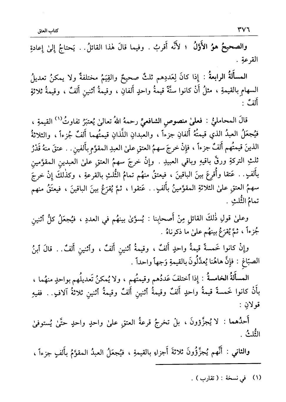 قال المحاملي: فعلى منصوص الشافعي - رَحِمَهُ اللَّهُ تَعَالَى - يعتبر تفاوت القيمة، فيجعل العبد الذي قيمته ألفان جزءاً، والعبدان اللذان قيمتهما ألف جزءاً، والثلاثة الذين قيمتهم ألف جزءاً، فإن خرج سهم العتق على العبد المقوم بألفين.. عتق منه قدر ثلث التركة ورق باقيه وباقي العبيد. وإن خرج سهم العتق على العبدين المقومين بألف.. عتقاً وأقرع بين الباقين، فيعتق منهم تمام الثلث بالقرعة، وكذلك إن خرج سهم العتق على الثلاثة المقومين بألف.. عتقوا، ثم يقرع بين الباقين، فيعتق منهم تمام الثلث.