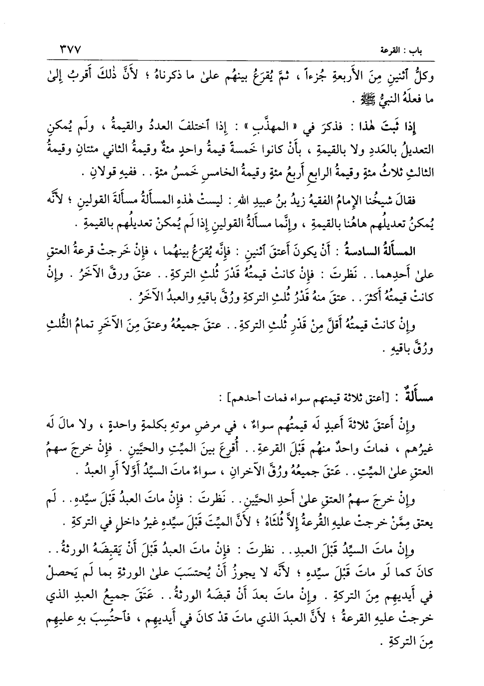 المسألة السادسة: أن يكون أعتق اثنين: فإنه يقرع بينهما، فإن خرجت قرعة العتق على أحدهما.. نظرت: فإن كانت قيمته قدر ثلث التركة.. عتق ورق الآخر، وإن كانت قيمته أكثر.. عتق منه قدر ثلث التركة ورق باقيه والعبد الآخر.