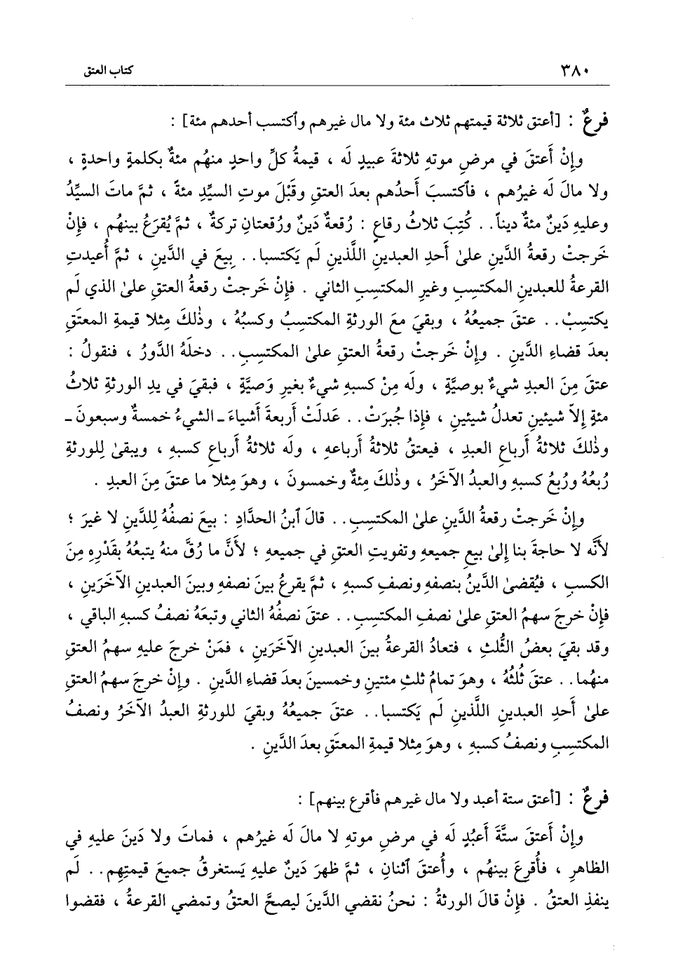 وإن خرجت رقعة الدين على المكتسب.. قال ابن الحداد: بيع نصفه للدين لا غير؛ لأنه لا حاجة بنا إلى بيع جميعه وتفويت العتق في جميعه؛ لأن ما رق منه يتبعه بقدره من الكسب، فيقضى الدين بنصفه ونصف كسبه، ثم يقرع بين نصفه وبين العبدين الآخرين، فإن خرج سهم العتق على نصف المكتسب.. عتق نصفه الثاني وتبعه نصف كسبه الباقي، وقد بقي بعض الثلث، فتعاد القرعة بين العبدين الآخرين، فمن خرج عليه سهم العتق منهما.. عتق ثلثه، وهو تمام ثلث مائتين وخمسين بعد قضاء الدين. وإن خرج سهم العتق على أحد العبدين اللذين لم يكتسبا.. عتق جميعه وبقي للورثة العبد الآخر ونصف المكتسب ونصفه كسبه، وهو مثلاً قيمة المعتق بعد الدين.