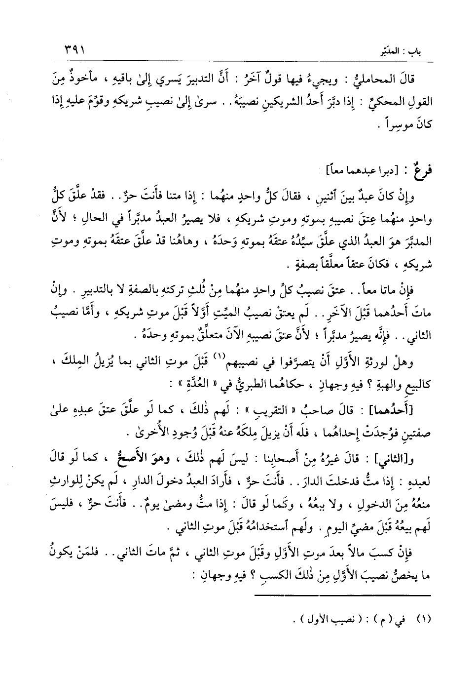 فإن ماتا معًا.. عتق نصيب كل واحد منهما من ثلث تركته بالصفة لا بالتدبير. وإن مات أحدهما قبل الآخر.. لم يعتق نصيب الميت أولًا قبل موت شريكه، وأما نصيب الثاني.. فإنه يصير مدبرًا؛ لأن عتق نصيبه الآن متعلق بموته وحده.
