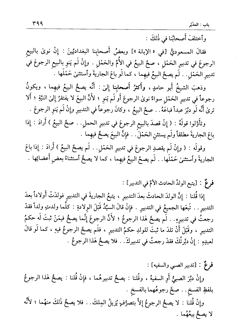 فقال المسعودي (في " الإبانة ") وبعض أصحابنا البغداديين: إن نوى بالبيع الرجوع في تدبير الحمل، صح البيع في الأم والحمل. وإن لم ينو بالبيع الرجوع في تدبير الحمل.. لم يصح البيع فيهما، كما لو باع الجارية واستثنى حملها.