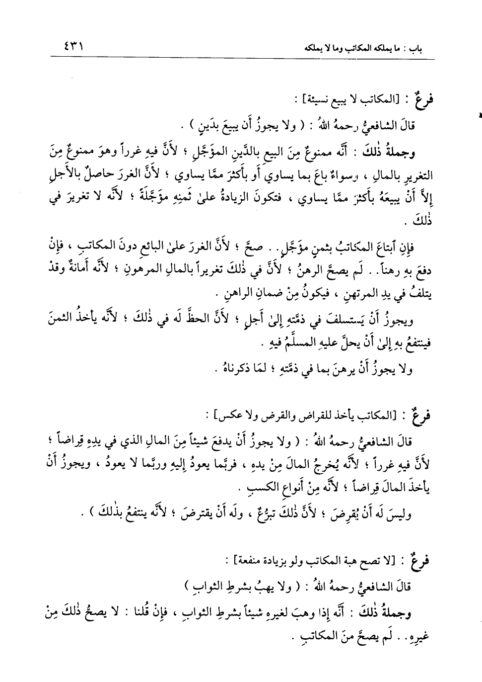 فإن ابتاع المكاتب بثمن مؤجل.. صح؛ لأن الغرر على البائع دون المكاتب، فإن دفع به رهنًا.. لم يصح الرهن؛ لأن في ذلك تغريرًا بالمال المرهون؛ لأنه أمانة وقد يتلف في يد المرتهن، فيكون من ضمان الراهن.