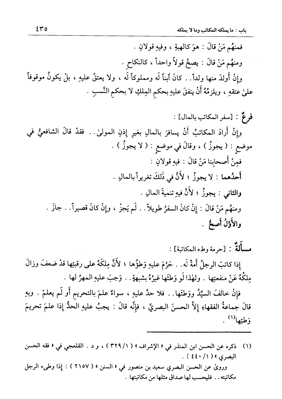 ) : وإن أراد المكاتب أن يسافر بالمال بغير إذن المولى فقد قال الشافعي في موضع: (يجوز) ، وقال في موضع: (لا يجوز) .