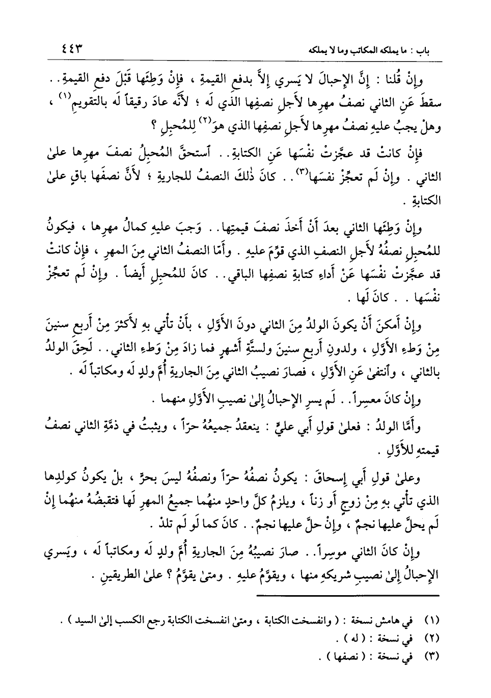 فإن كانت قد عجزت نفسها عن الكتابة.. استحق المحبل نصف مهرها على الثاني. وإن لم تعجز نفسها.. كان ذلك النصف للجارية؛ لأن نصفها باق على الكتابة.