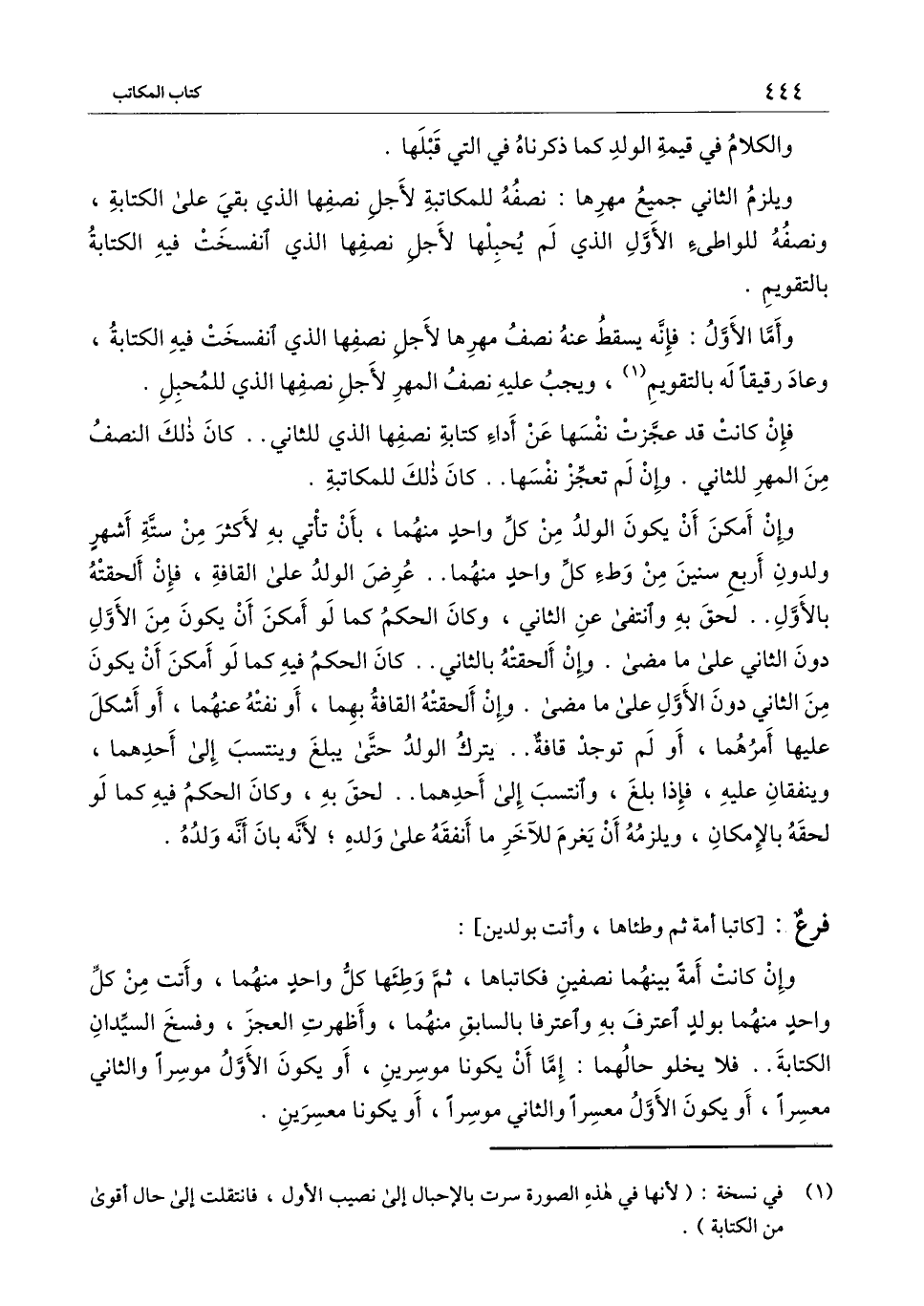 فإن كانت قد عجزت نفسها عن أداء كتابة نصفها الذي للثاني.. كان ذلك النصف من مهرها للثاني. وإن لم تعجز نفسها.. كان ذلك للمكاتبة.