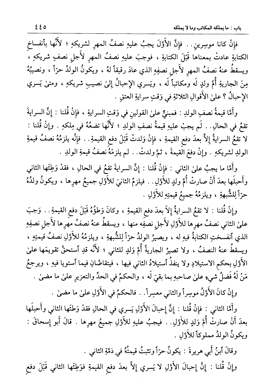 وإن قلنا: لا تقع السراية إلا بعد دفع القيمة، وكان وطؤه قبل دفع القيمة.. وجب على الثاني نصف مهرها للأول لأجل نصفه منها، ويسقط عنه نصف مهرها لأجل نصفه الذي انفسخت الكتابة فيه له، ويصير الولد حرًا للشبهة، ويلزمه للأول نصف قيمته، ويسقط عنه النصف، ولا تصير الجارية أم ولد للثاني؛ لأنه قد استحق تقويمها على الأول بحكم الاستيلاد ولا ينفذ استيلاد الثاني فيها، فيتقاصان فيما استويا فيه، ويرجع من له فضل شيء على صاحبه بما بقي له، والحكم في الحد والتعذير على ما مضى.