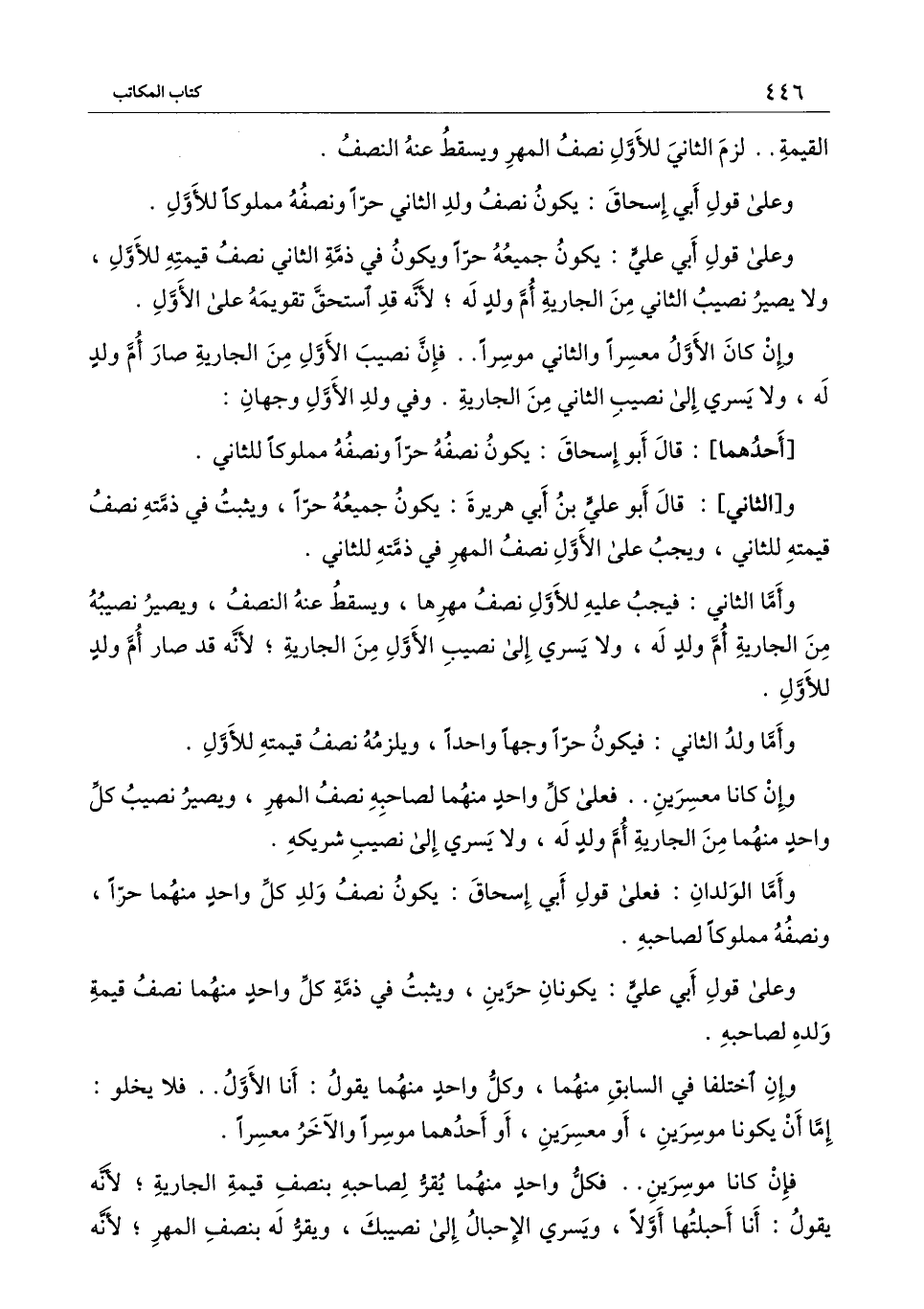 وعلى قول أبي إسحاق: يكون نصف ولد الثاني حرًا ونصفه مملوكًا للأول.