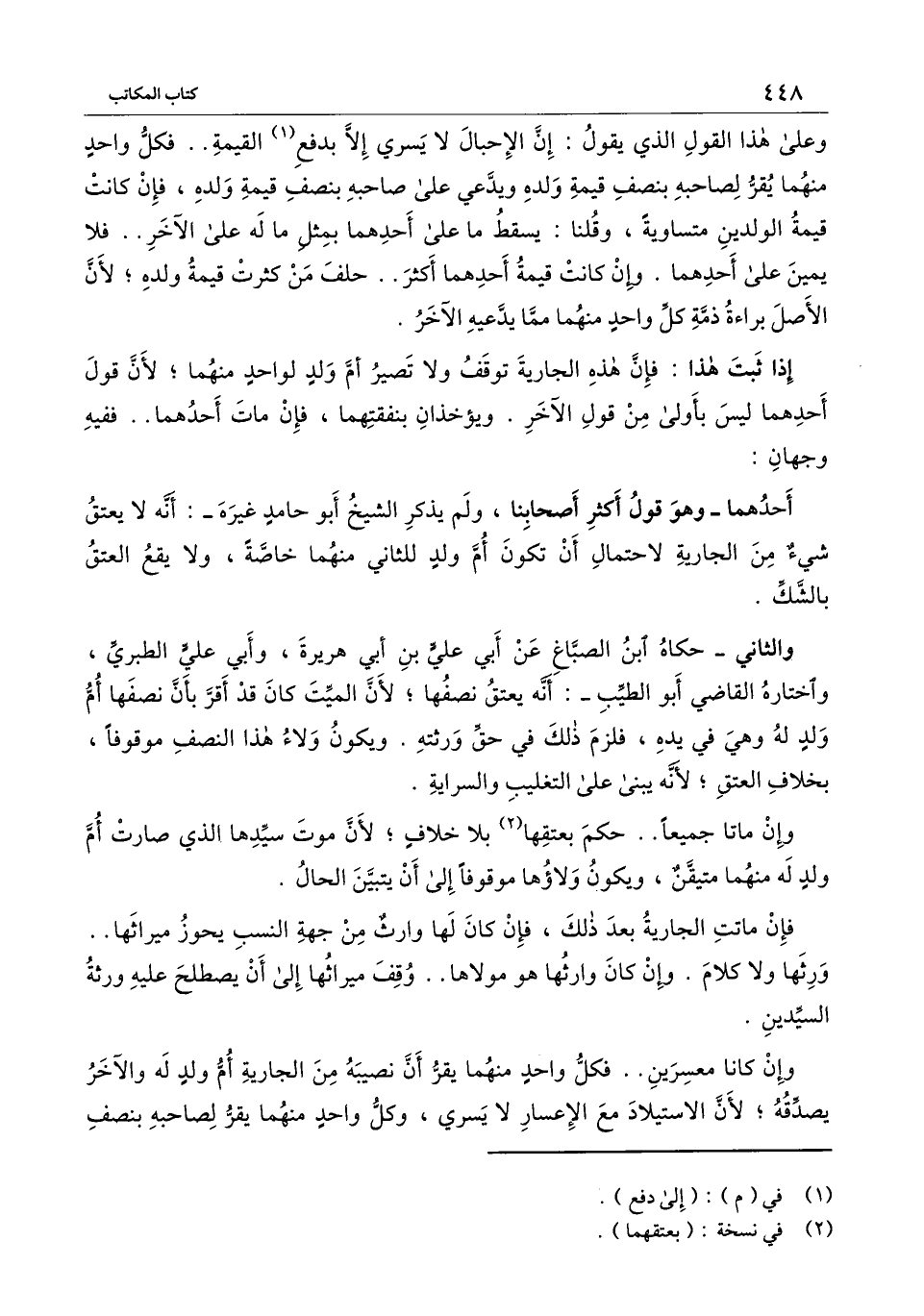 والثاني ـ حكاه ابن الصباغ عن أبي علي بن أبي هريرة، وأبي علي الطبري، واختاره القاضي أبو الطيب ـ: أنه يعتق نصفها؛ لأن الميت كان قد أقر بأن نصفها أم ولد له وهي في يده، فلزم ذلك في حق ورثته. ويكون ولاء هذا النصف موقوفًا، بخلاف العتق؛ لأنه يبنى على التغليب والسراية.
