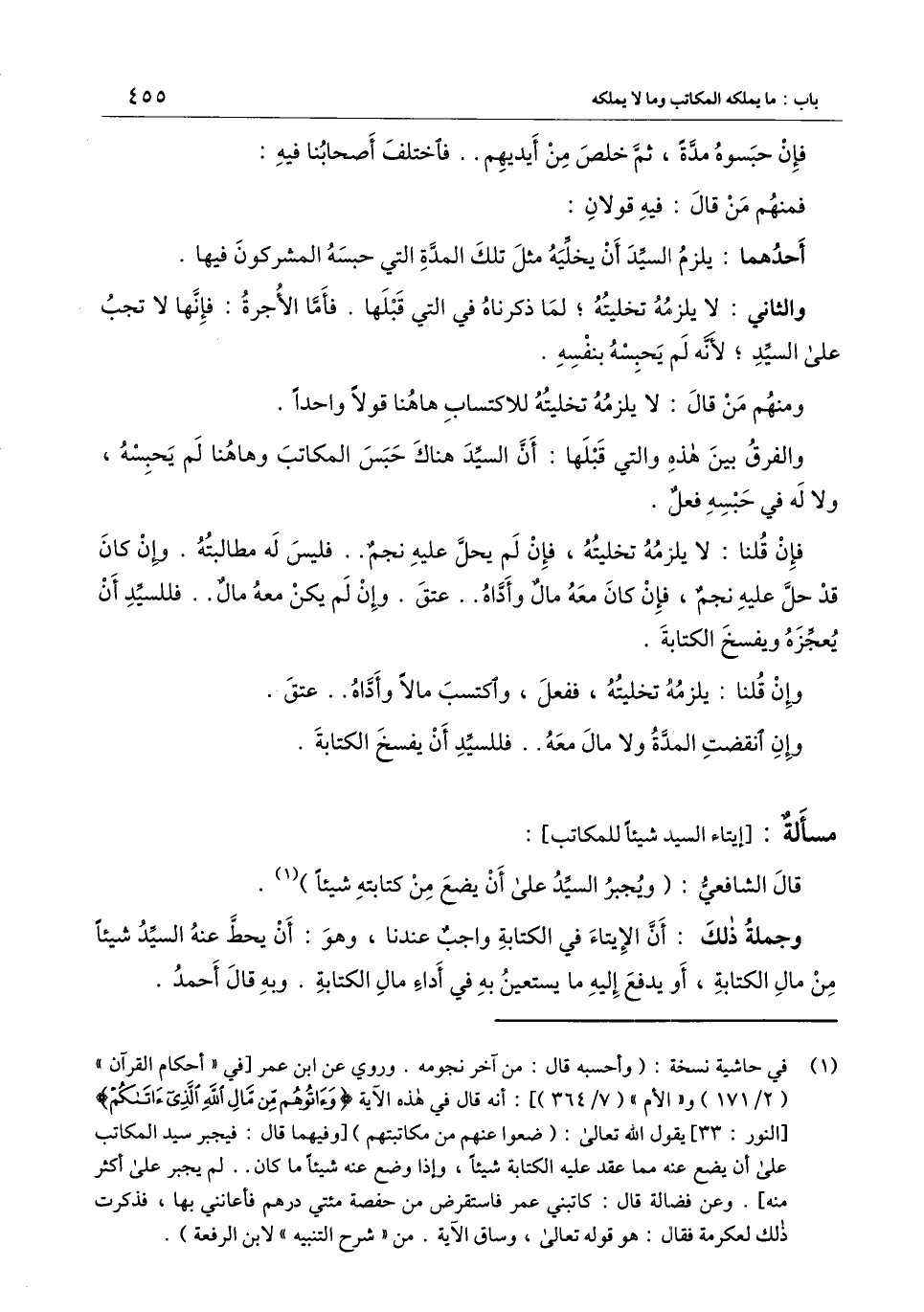 ) : قال الشافعي: (ويجبر السيد على أن يضع من كتابته شيئًا) . وجملة ذلك: أن الإيتاء في الكتابة واجب عندنا، وهو: أن يحط عنه السيد شيئًا من مال الكتابة، أو يدفع إليه ما يستعين به في أداء مال الكتابة. وبه قال أحمد.