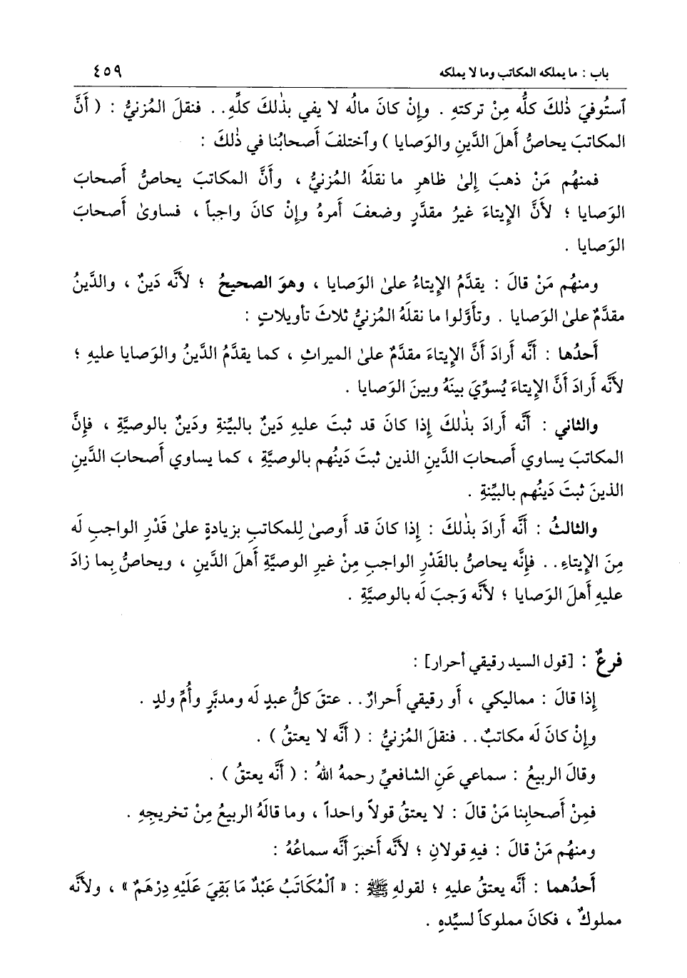 والثالث: أنه أراد بذلك: إذا كان قد أوصى للمكاتب بزيادة على قدر الواجب له من الإيتاء.. فإنه يحاص بالقدر الواجب من غير الوصية أهل الدين، ويحاص بما زاد عليه أهل الوصايا؛ لأنه وجب له بالوصية.