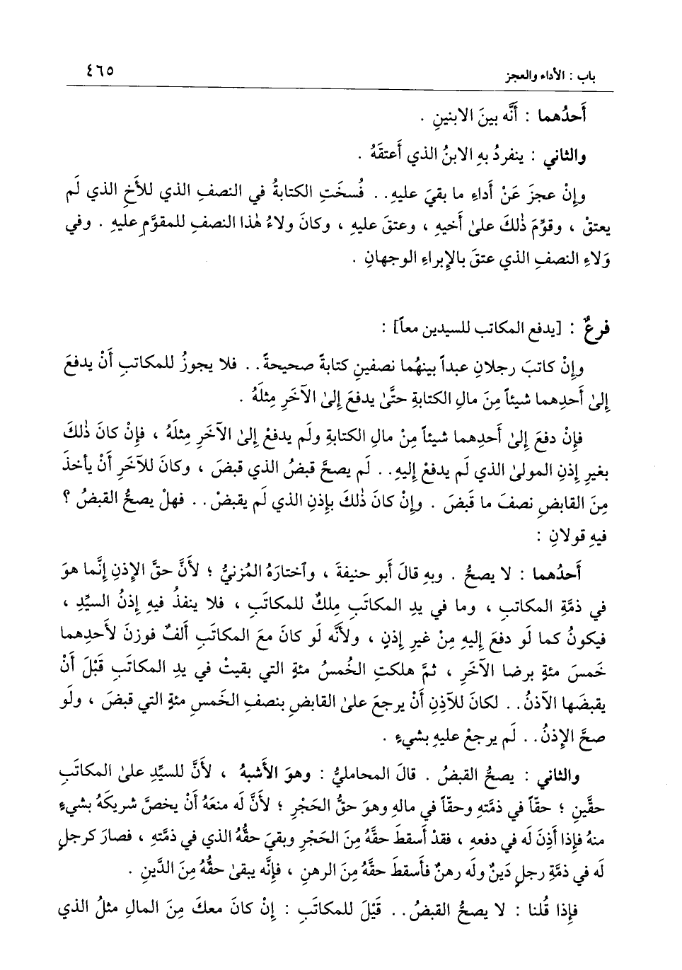 فرع: (يدفع المكاتب للسيدين) : وان كاتب رجلان عبدًا بينهما نصفين كتابة صحيحة.. فلا يجوز للمكاتب أن يدفع إلى أحدهما شيئا من مال الكتابة حتى يدفع إلى الآخر مثله. فإن دفع إلى أحدهما شيئا من مال الكتابة، ولم يدفع إلى الآخر مثله، فإن كان ذلك بغير إذن المولى الذي لم يدفع إليه.. لم يصح قبض الذي قبض، وكان للآخر أن يأخذ من القابض نصف ما قبض. وإن كان ذلك بإذن الذي لم يقبض.. فهل صح القبض؟ فيه قولان: