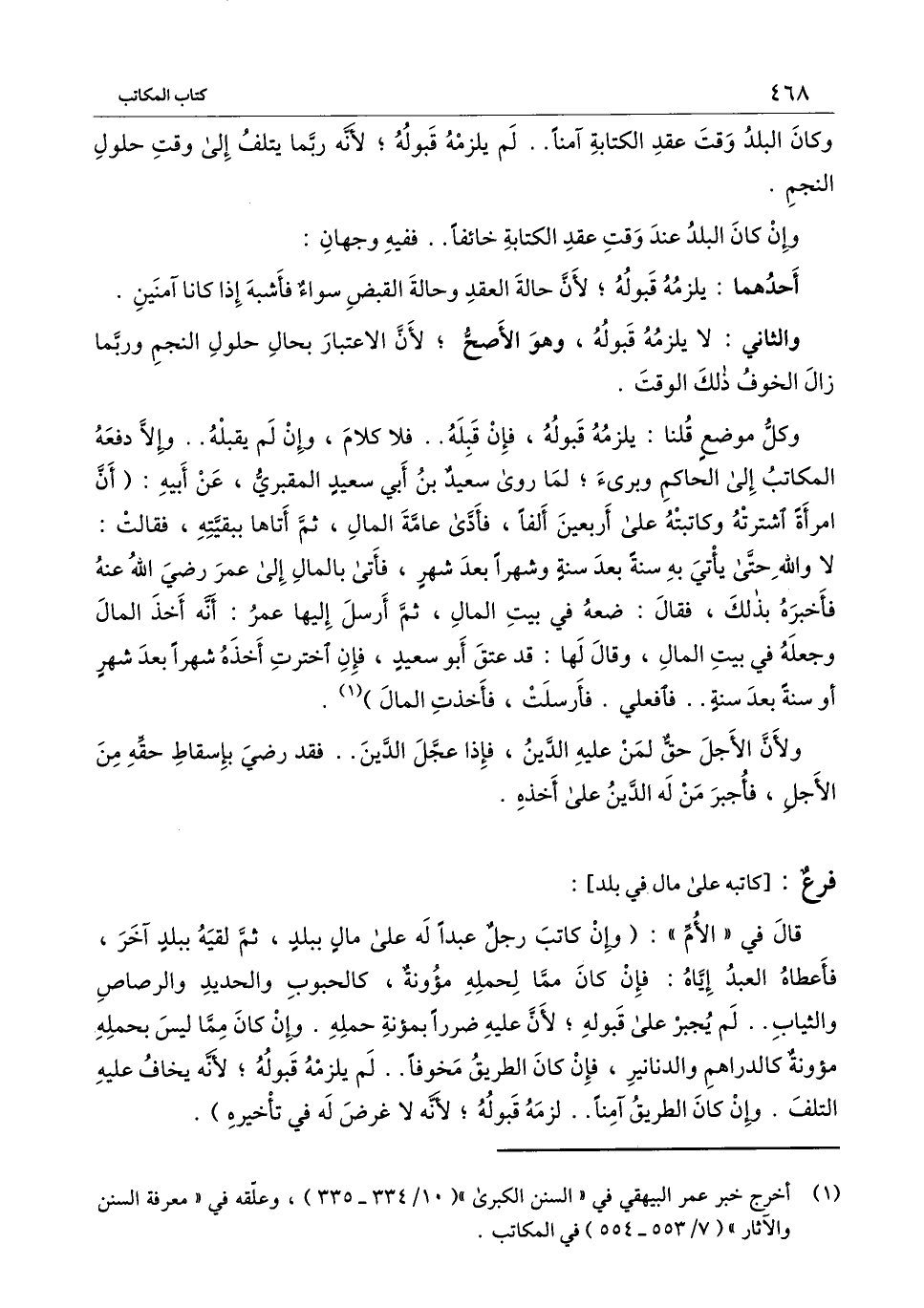 وكان البلد وقت عقد الكتابة آمنا.. لم يلزمه قبوله؛ لأنه ربما يتلف إلى وقت حلول النجم.
