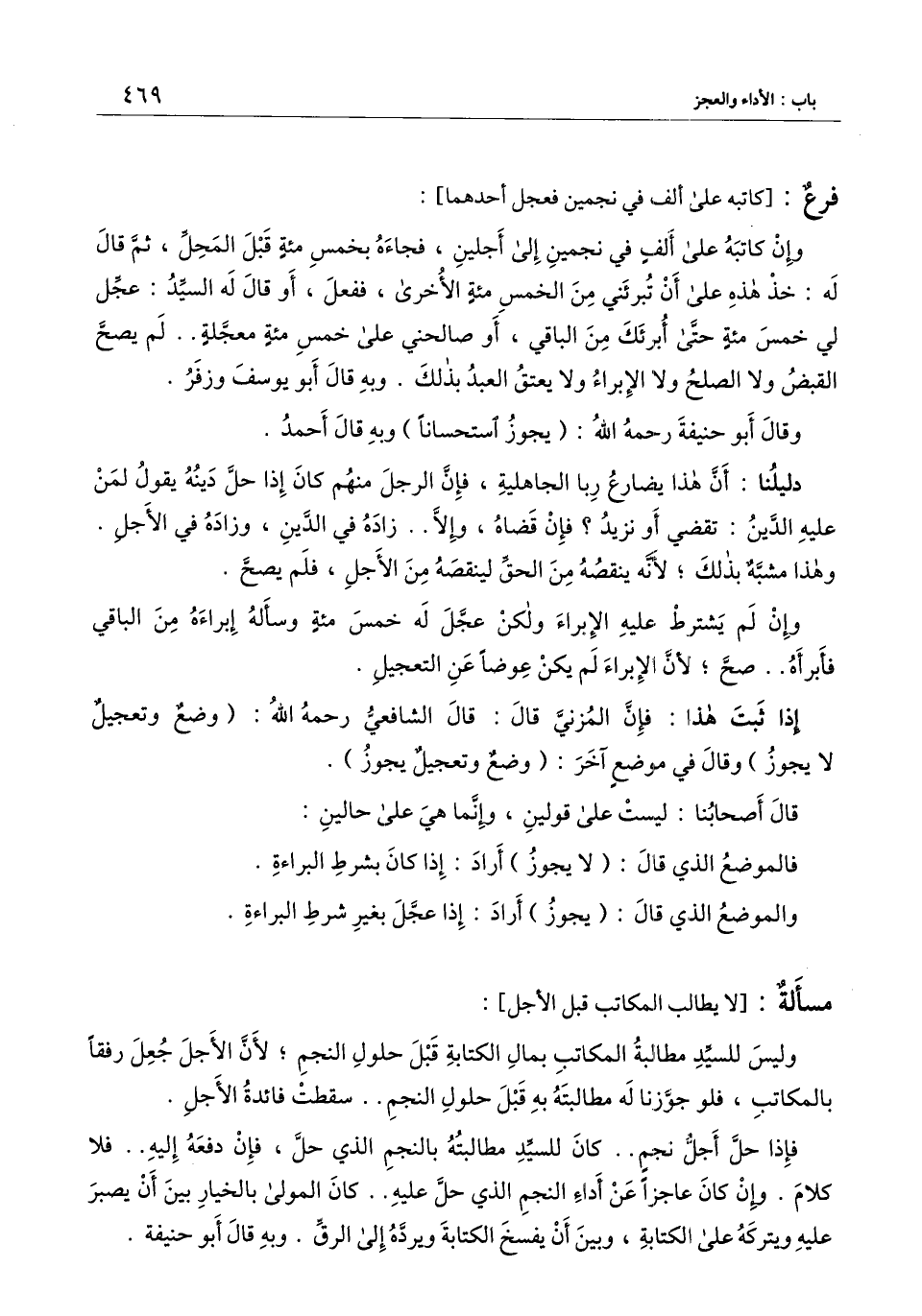 ) : وإن كاتبه على ألف في نجمين إلى أجلين، فجاءه بخمسمائة قبل المحل، ثم قال له: خذ هذه على أن تبرئني من الخمسمائة الأخرى، ففعل، أو قال له السيد: عجل لي خمسمائة حتى أبرئك من الباقي، أو صالحني على خمسمائة معجلة.. لم يصح القبض ولا الصلح ولا الإبراء ولا يعتق العبد بذلك. وبه قال أبو يوسف وزفر.
