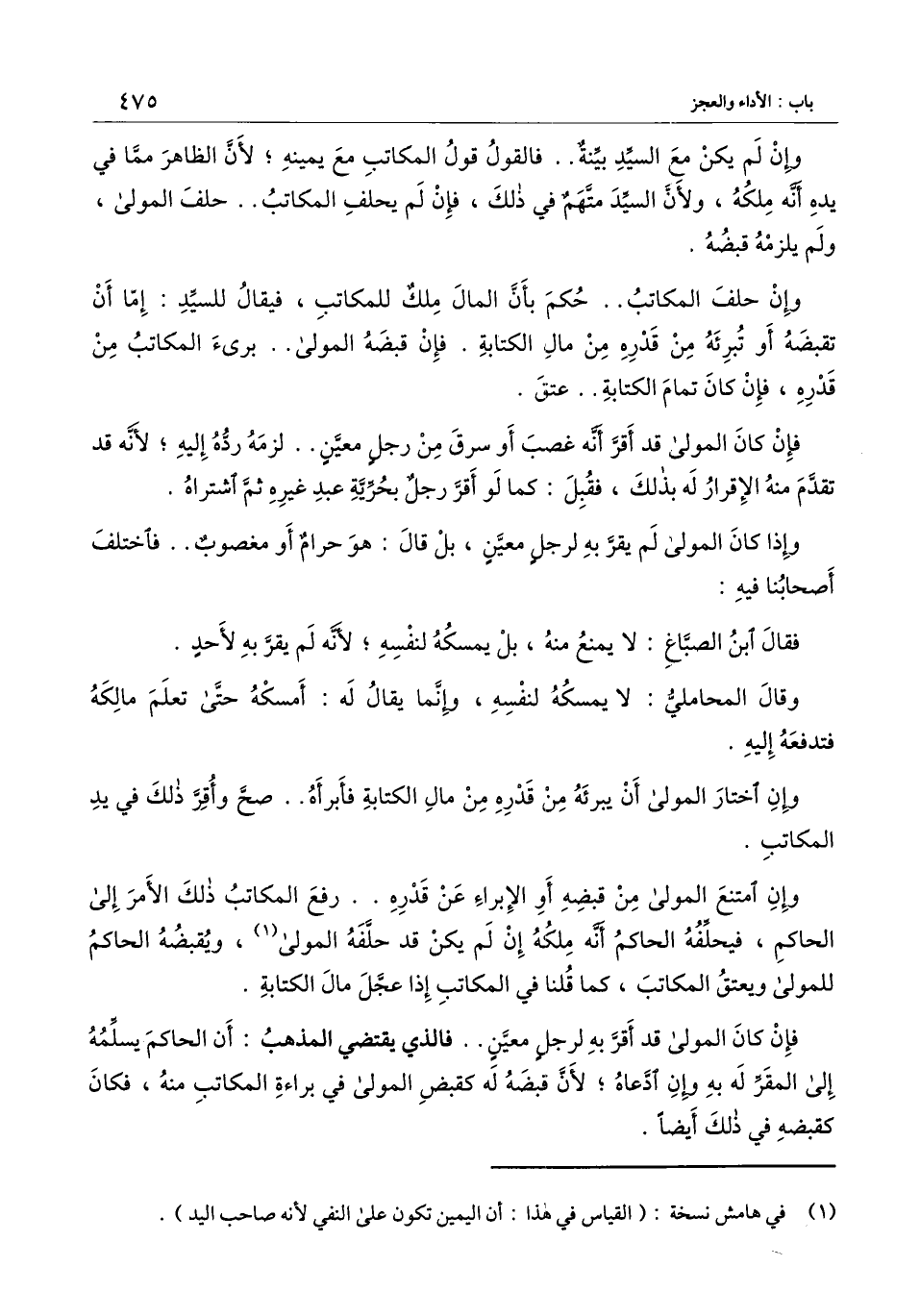وإن حلف المكاتب.. حكم بأن المال ملك للمكاتب، فيقال للسيد: إما أن تقبضه أو تبرئه من قدره من مال الكتابة. فإن قبضه المولى.. برئ المكاتب من قدره، فإن كان تمام الكتابة.. عتق.