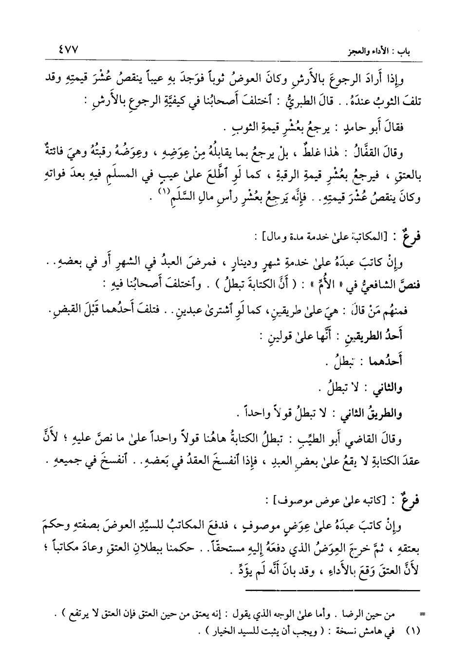 وقال القفال: هذا غلط، بل يرجع بما يقابله من عوضه، وعوضه رقبته وهي فائته بالعتق، فيرجع بعشر قيمة الرقبة، كما لو اطلع على عيب في المسلم فيه بعد فواته وكان ينقص عشر قيمته.. فإنه يرجع بعشر رأس مال السلم.