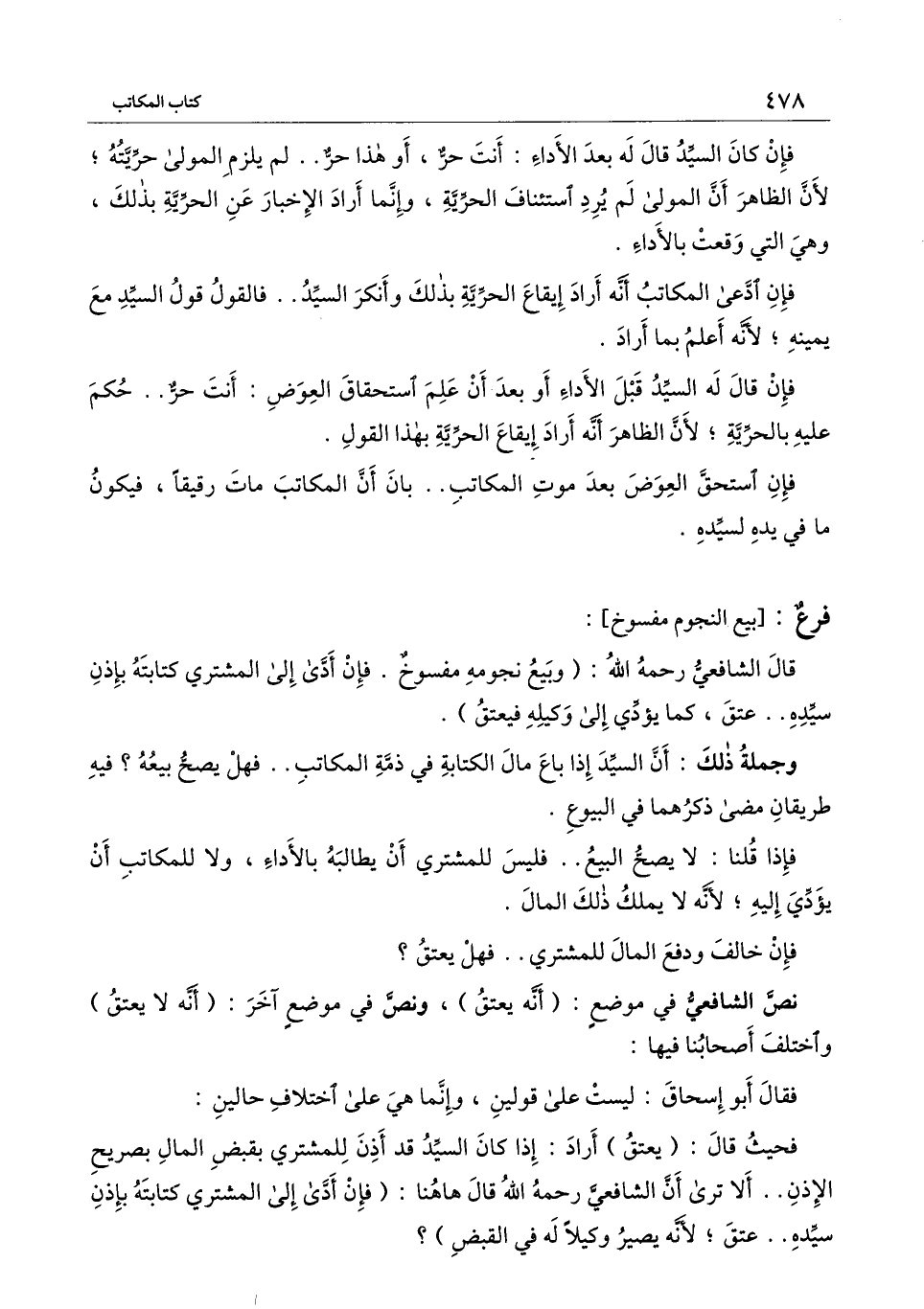 ) : قال الشافعي - رَحِمَهُ اللَّهُ -: (وبيع نجومه مفسوخ. فإن أدى إلى المشتري كتابته بإذن سيده.. عتق، كما يؤدي إلى وكيله فيعتق) .
