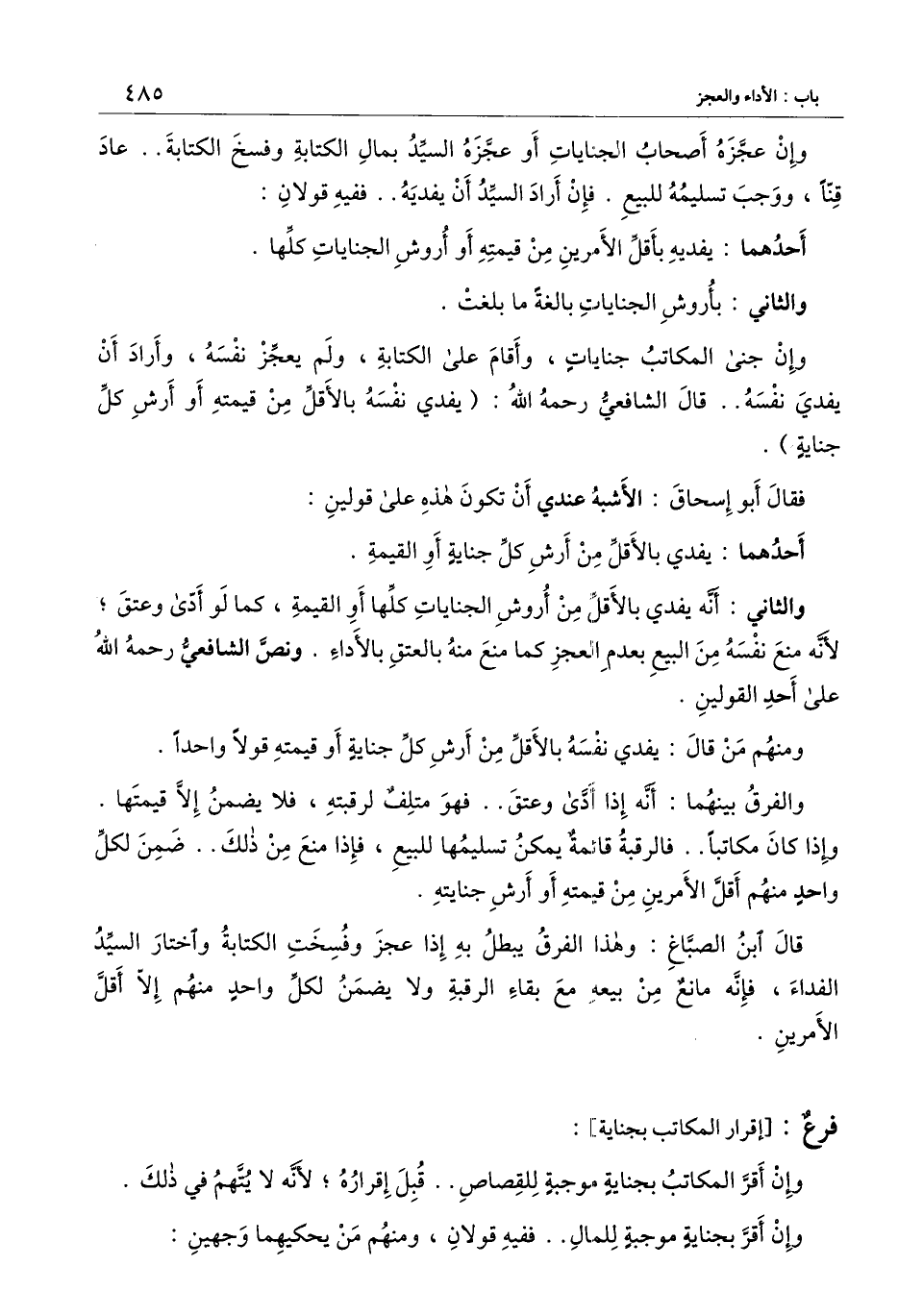 وإن عجزه أصحاب الجنايات أو عجزه السيد بمال الكتابة وفسخ الكتابة.. عاد قنا، ووجب تسليمه للبيع. فإن أراد السيد أن يفديه.. ففيه قولان: