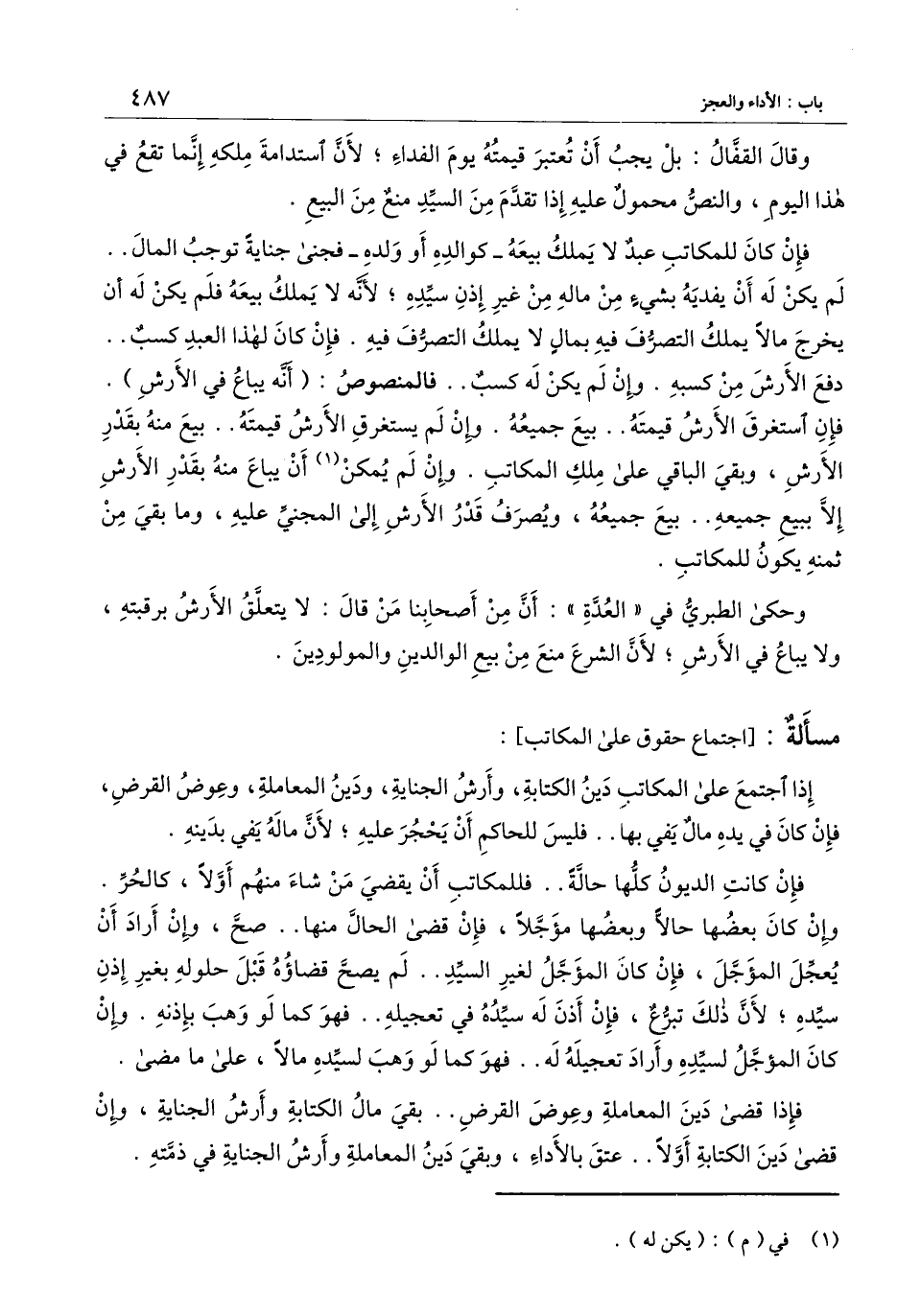 فإذا قضى دين المعاملة وعوض القرض.. بقي مال الكتابة وأرش الجناية، وإن قضى دين الكتابة أولا.. عتق بالأداء، وبقي دين المعاملة وأرش الجناية في ذمته.