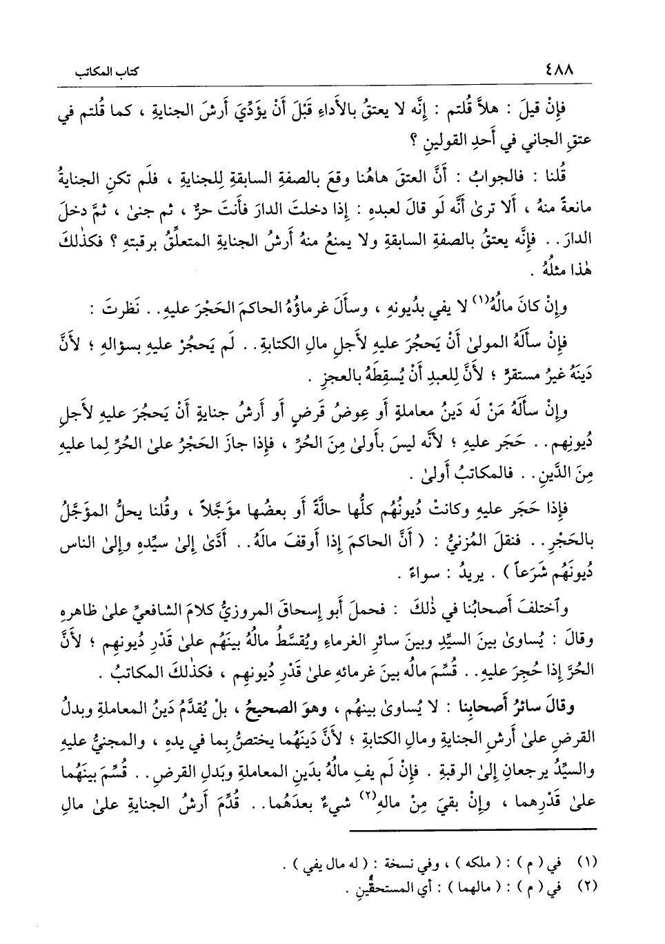 وإن سأله من له دين معاملة أو عوض قرض أو أرش جناية أن يحجر عليه لأجل ديونهم.. حجر عليه؛ لأنه ليس بأولى من الحر، فإذا جاز الحجر على الحر لما عليه من الدين.. فالمكاتب أولى. فإذا حجر عليه وكانت ديونهم كلها حالة أو بعضها مؤجلا، وقلنا يحل المؤجل بالحجر.. فنقل المزني: (أن الحاكم إذا أوقف ماله.. أدى إلى سيده وإلى الناس ديونهم شرعا) . يريد: سواء.